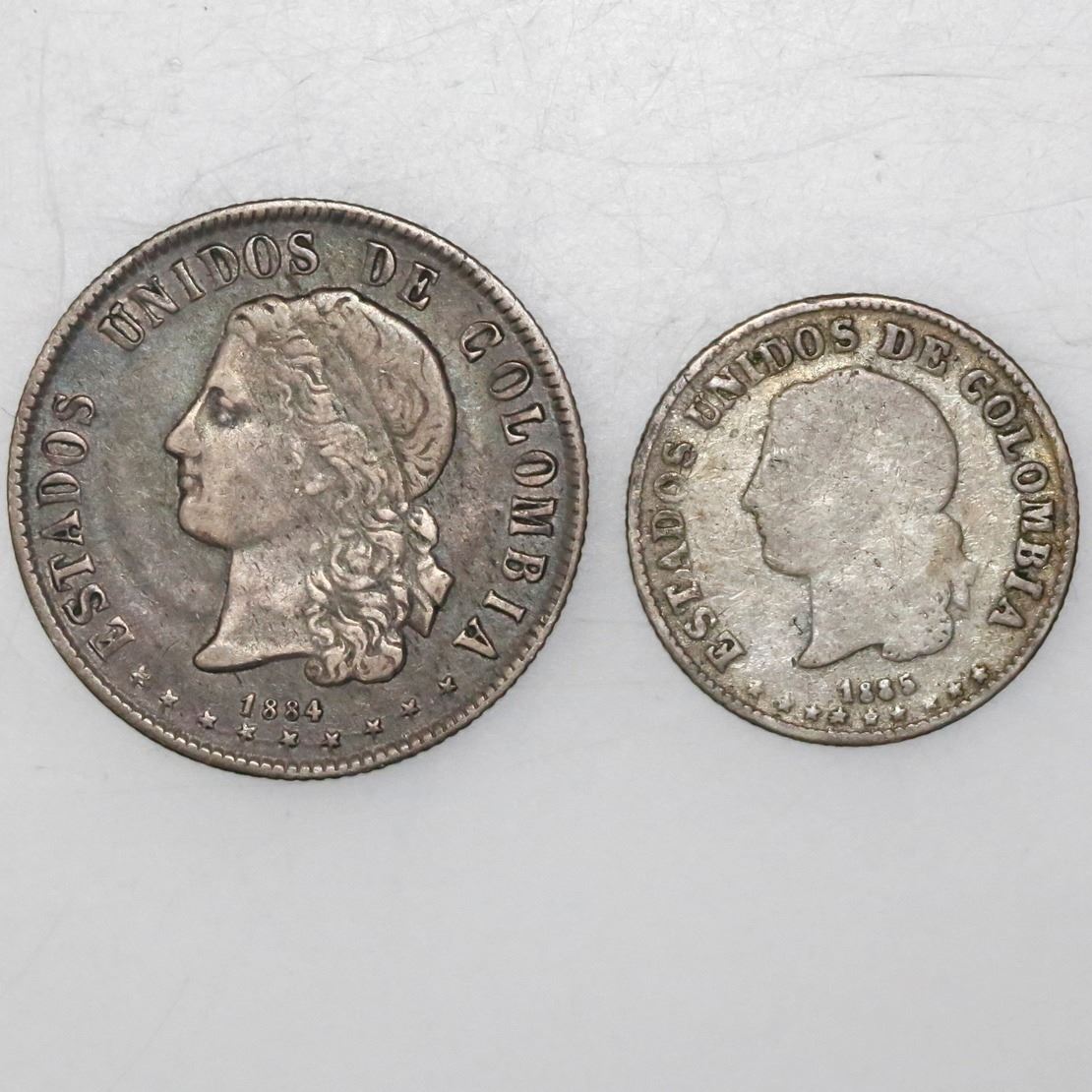 Lot of two Medellin, Colombia, 20 and 10 centavos, 1884 & 1885. KM-178.3, 175.2; KM-178.3, 175.2. 7.47 grams total. The 1884 20 centavos with the "GRAMOS 5" variety is VF+ with light rainbow toning. The 1885 10 centavos is Fine, with similar toning.