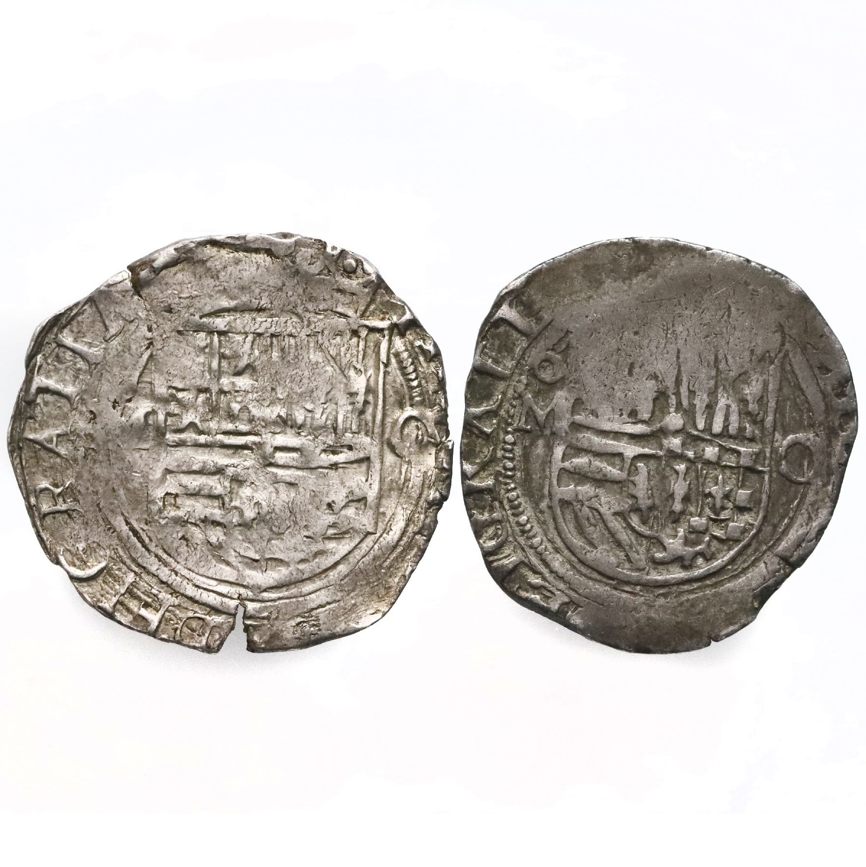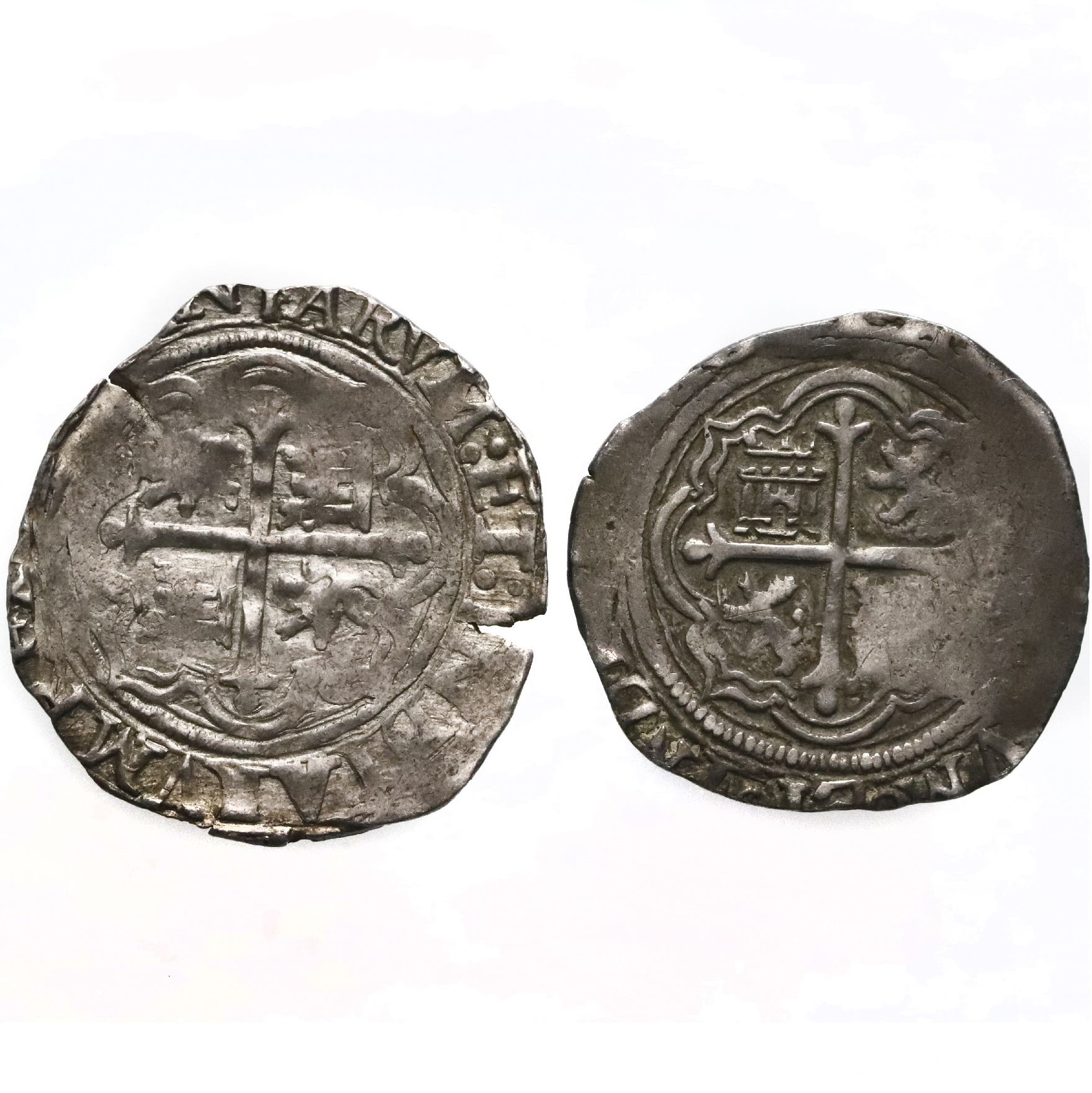 Lot of two Mexico City, Mexico, cob 1R, Philip II, assayer O to right, mintmark oM to left (oM-O). S-M11; KM-26; Cal-224. 6.67 grams total. One is a choice XF with full cross and some luster, the other is VF with light sedimentation.