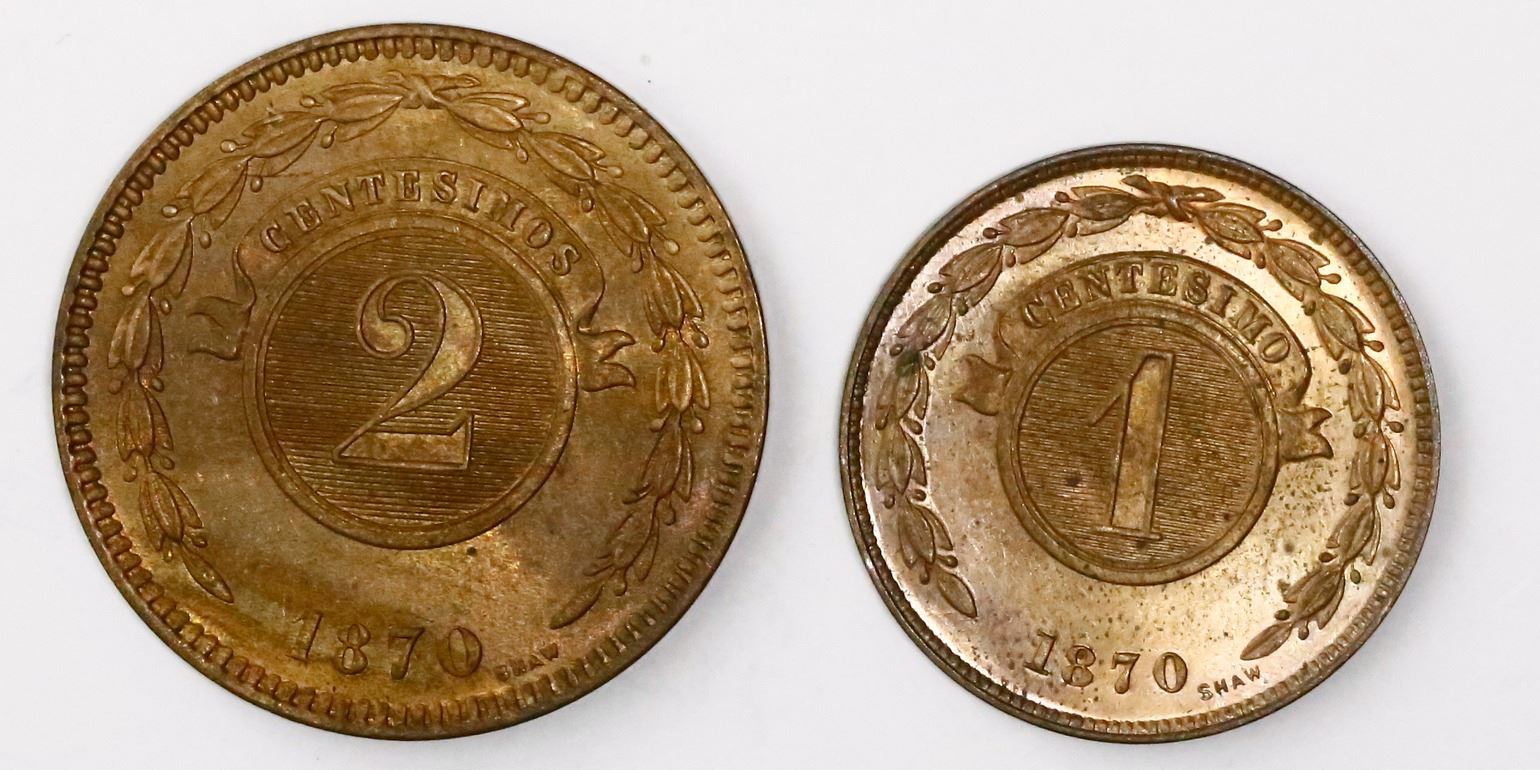 Lot of two Paraguay copper minors (2 and 1 centesimos) of 1870, ex-Heaton Mint. KM-3, 2. 15.40 grams total Pair of two high-grade coins, most likely specimens given their origin from the Heaton Mint archives (sold in 1979 to Spink) and that a number have turned up on the market in NGC slabs with specimen grades. These pieces are especially well-struck with sharp rims and smooth, semi-lustrous surfaces, scattered small carbon spots and some fingerprints noted, overall red color with streaks of brown and purple. Pedigreed to the Heaton Mint archives.