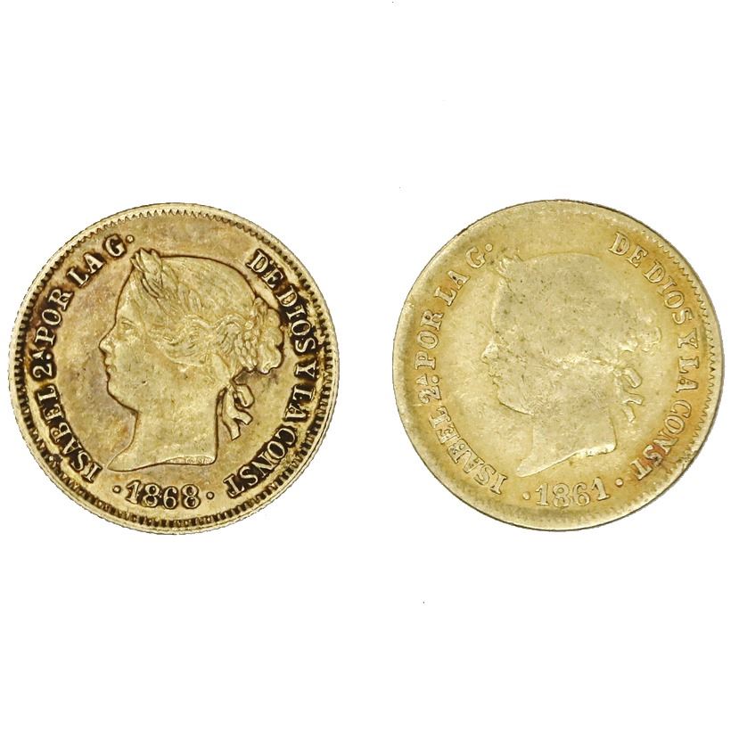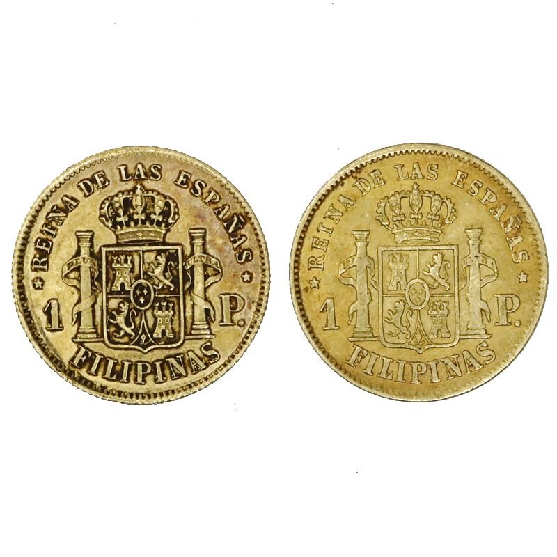 Lot of two Philippines (under Spain), gold 1 pesos, Isabel II: 1861 and 1868. KM-142; Cal-Type 215. 3.28 grams total. One Fine with light scratches on the reverse, the other VF with light sedimentation.