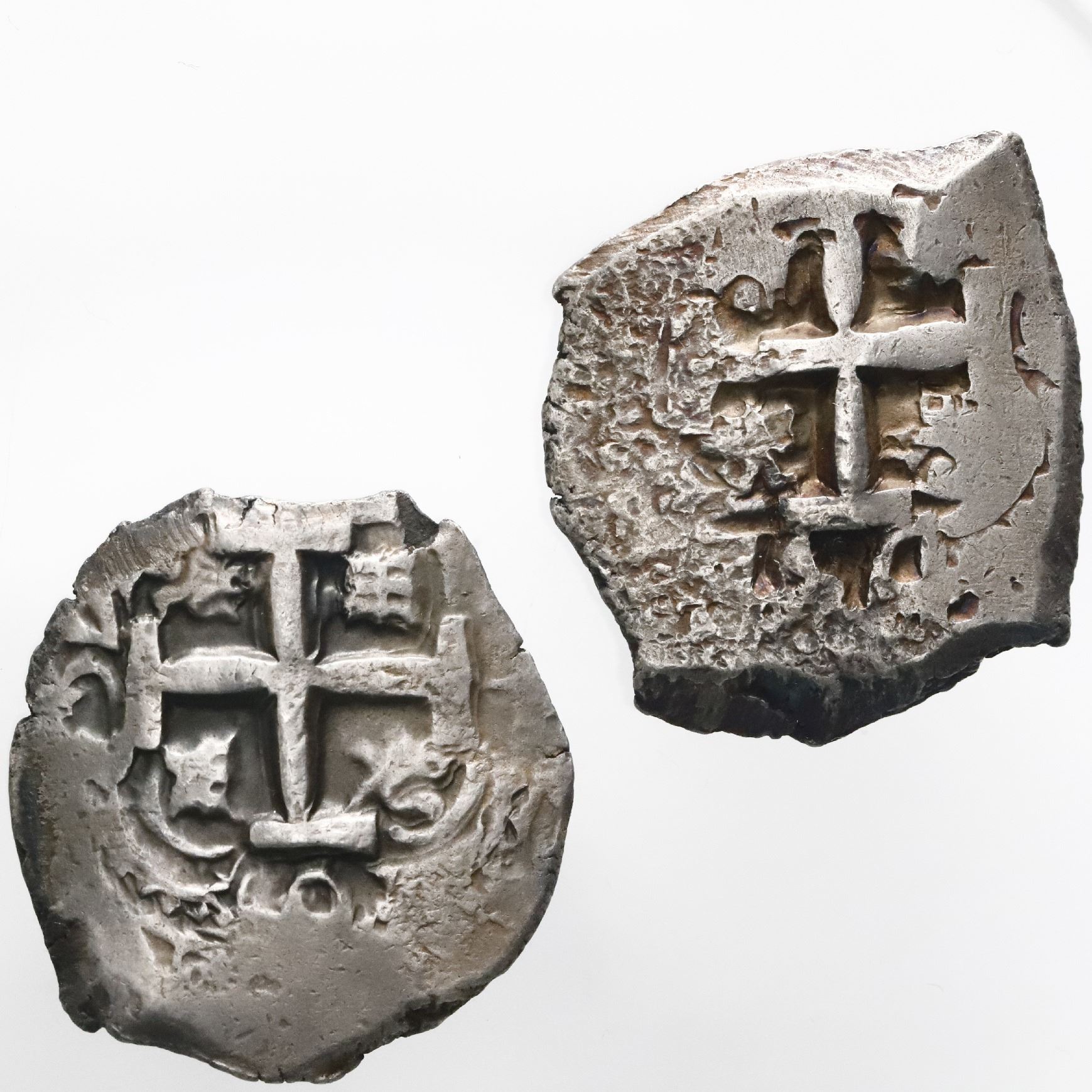 Lot of two Potosi, Bolivia, cob 4 reales: 1753(C or q) and 1754C/q. KM-39. 26.98 grams total. Both nice and bold with full crosses and grading XF or slightly better, colorful toning in fields, two visible dates on each.