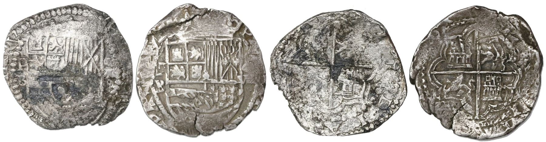 Lot of two Potosi, Bolivia, cob 8 reales, Philip II, assayer B (3rd and 5th periods).