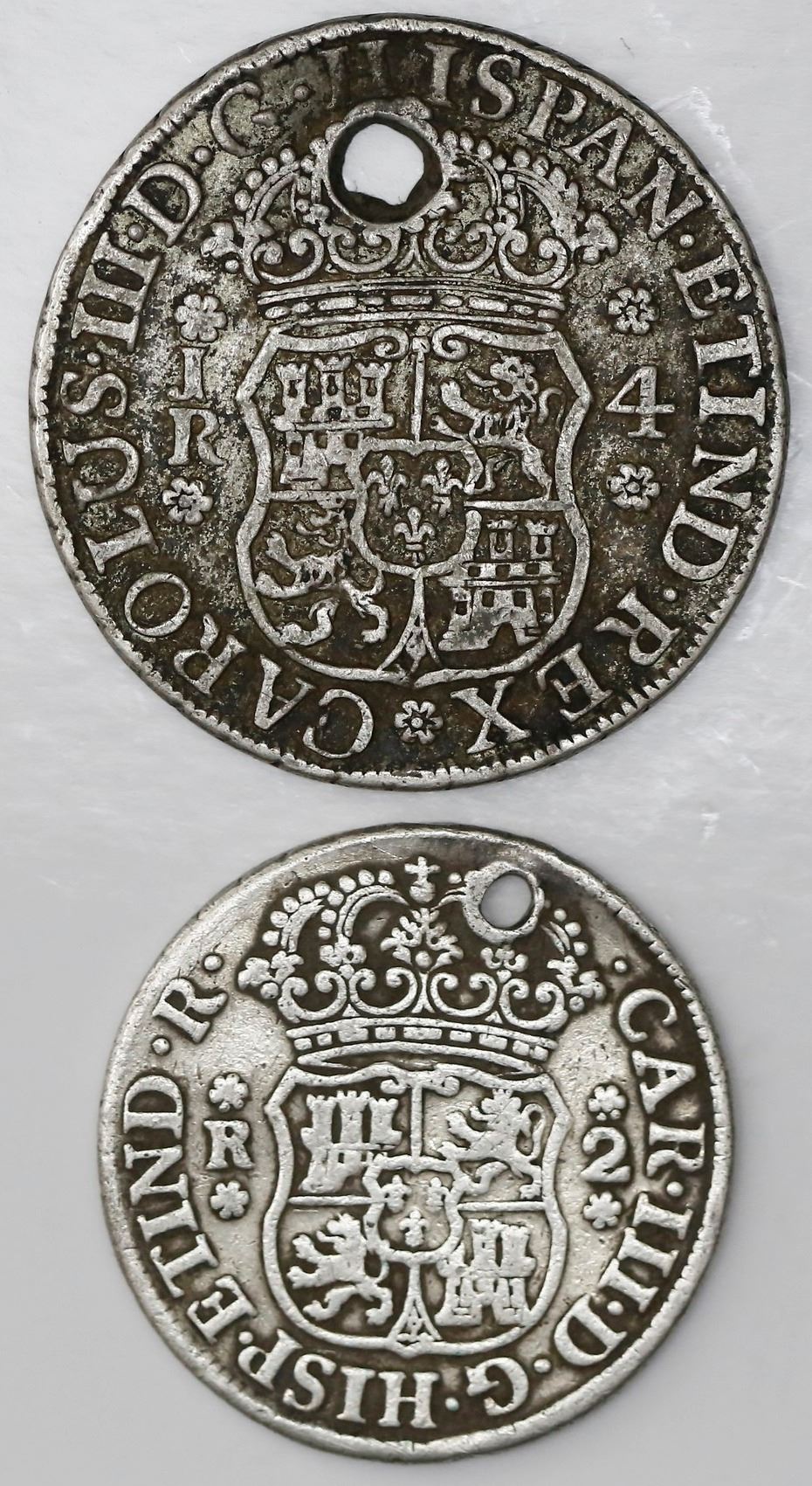 Lot of two Potosi, Bolivia, pillar minors of 1769JR: 4R, fancy 9; 2R, round 9. KM-49, 48; CT-1170, 1379. 19.59 grams total. Both holed, the 4R being XF with dark patches and the 2R being a cleaned VF.