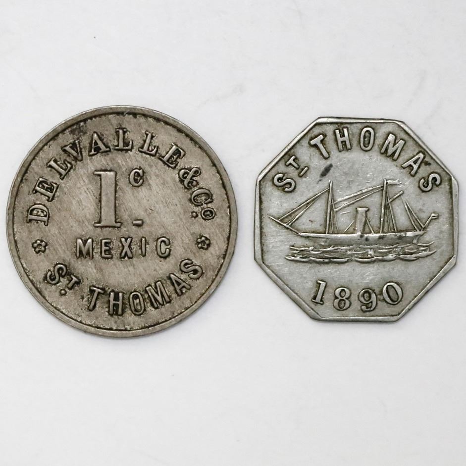 Lot of two St. Thomas, Danish West Indies, copper-nickel merchant tokens, ca. 1880 and 1890. 3.58 grams total. Decent VFs, as follows: Russell Bros 2c MEX TOKEN octagonal with ship over date 1890 on reverse (Eklund 2026, Higgie 446); Delvalle & Co. 1c MEXIC (same design both sides), ca. 1880 (Rulau Vrg-14, Higgie 411).