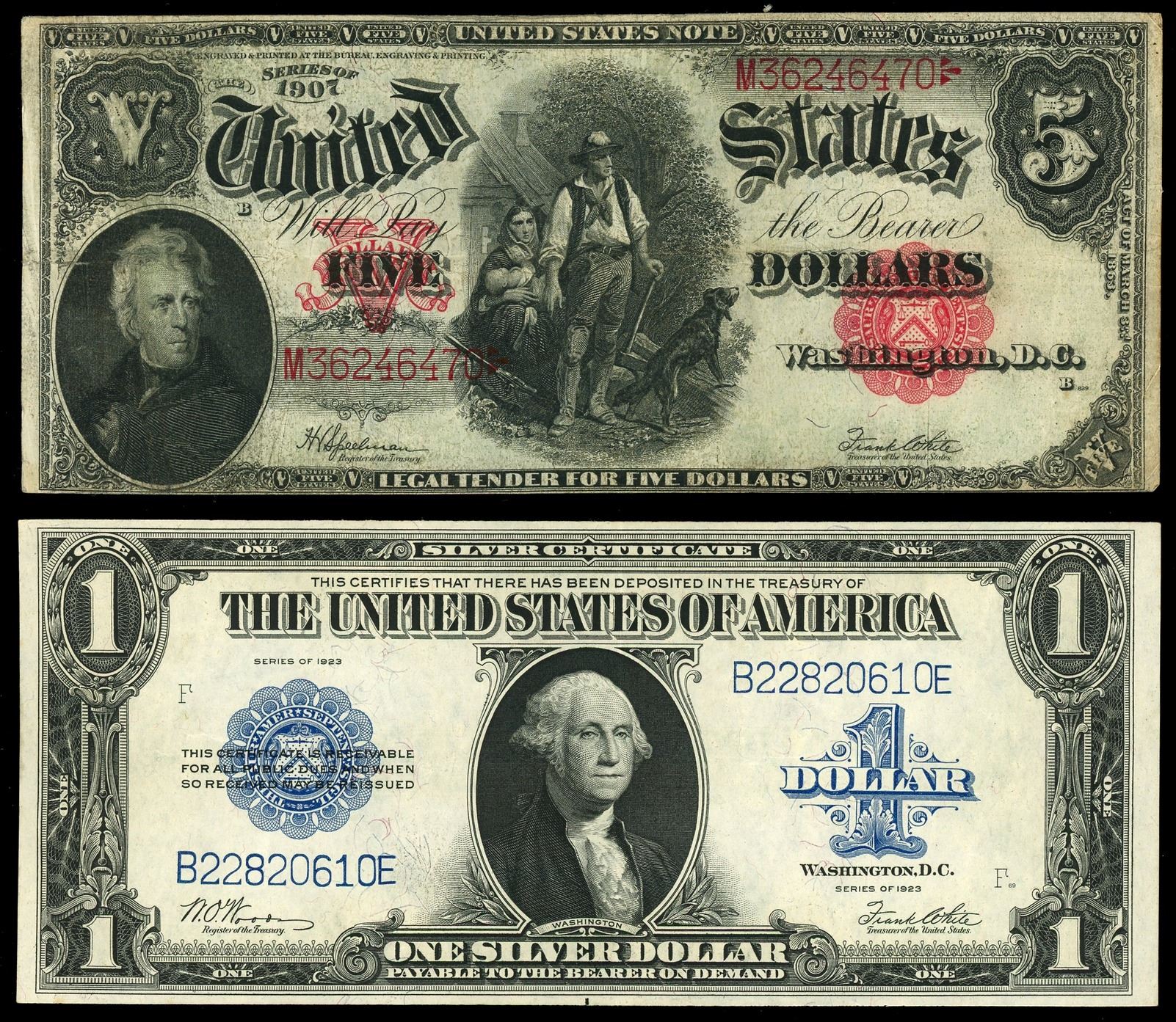 Lot of two USA (Washington, D.C. notes: United States Note, $5, series of 1907, serial M36246470, Speelman-White, with PCBLIC error; Silver Certificate, $1, series of 1923, serial B22820610E, Mooney-White. FR-91, 238. The $5 is VF with soiling while the $1 is XF with no problems.
