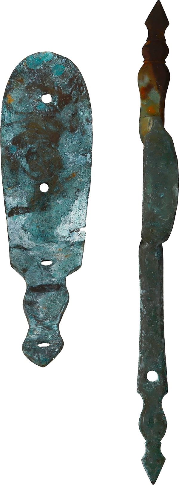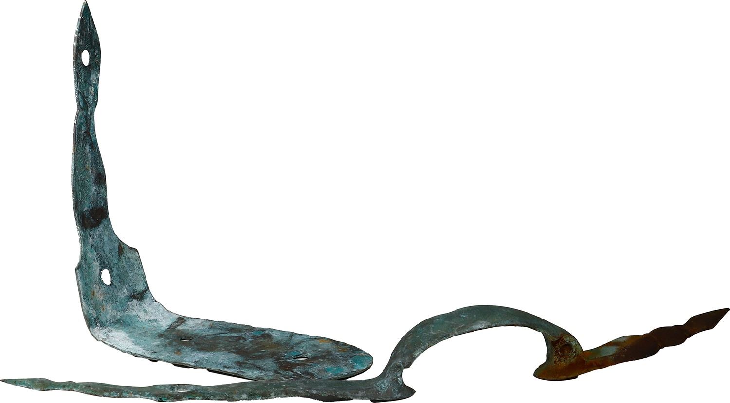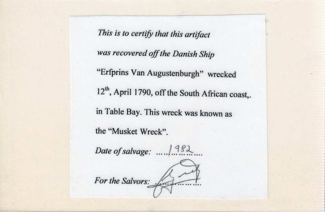 Lot of two brass musket parts (trigger guard and buttplate), ex-"Musket Wreck" (1790). 236 grams total. Up to 12" long. Heavily patinated but 100% intact, both with readable markings (like AE in a box and an incuse circle with three points), basically the leftovers of a musket whose wood and iron were lost to the elements. From the "Musket Wreck" (1790), pedigreed to Sedwick Auction 9, with original lot-tag 2052 and small (generic) certificates from the salvors.