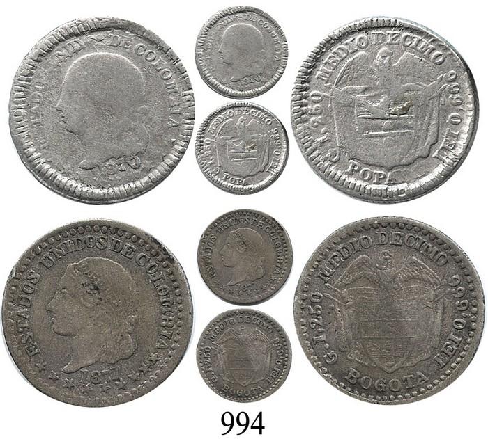 Lot of two ½ décimos, Popayán 1870 and Bogotá 1871. KM-150.3 and 150.1. 1.2 and 1.0 grams. Both Fine, the Popayán specimen with bronze toning all over.