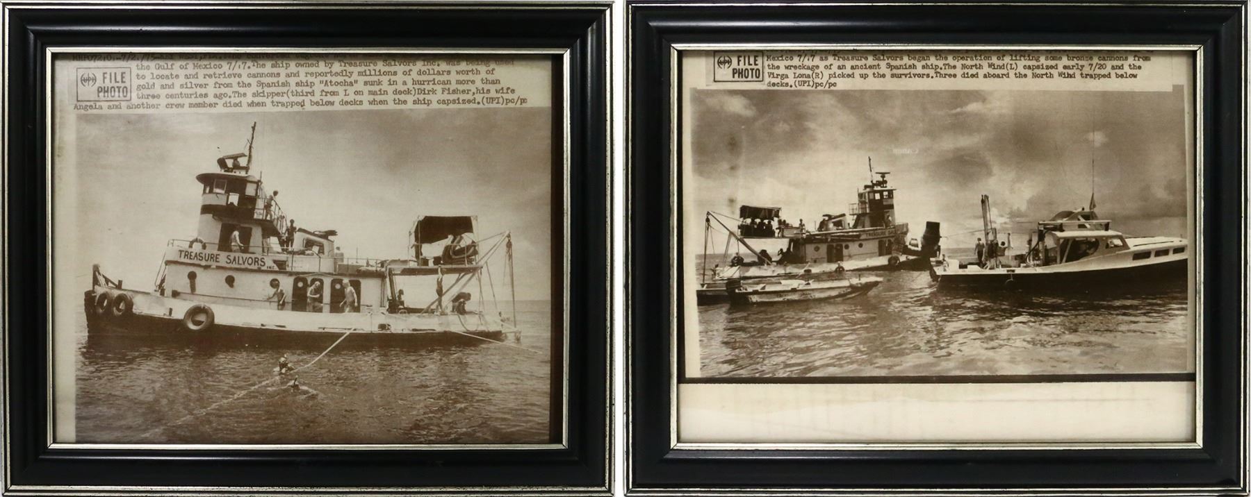Lot of two framed UPI black-and-white photographs from 1975 showing the Treasure Salvors vessel North Wind before it capsized while searching for the Atocha. 13" x 10" each in frames. Each one stamped UPI FILE PHOTO at top left, with captions at top left giving dates and description of scenes, one showing divers "lifting some bronze cannons from the wreckage" and the other showing the North Wind with personnel on board, including "Dirk Fisher, his wife Angela [sic] and another crew member" who "died when trapped below decks when the ship capsized," the photos clearly aged (faded and starting to crack a little) but still sharp and obviously very important to fans of Atocha and Fisher history. Pedigreed to our Auction 18 (lot #1161).