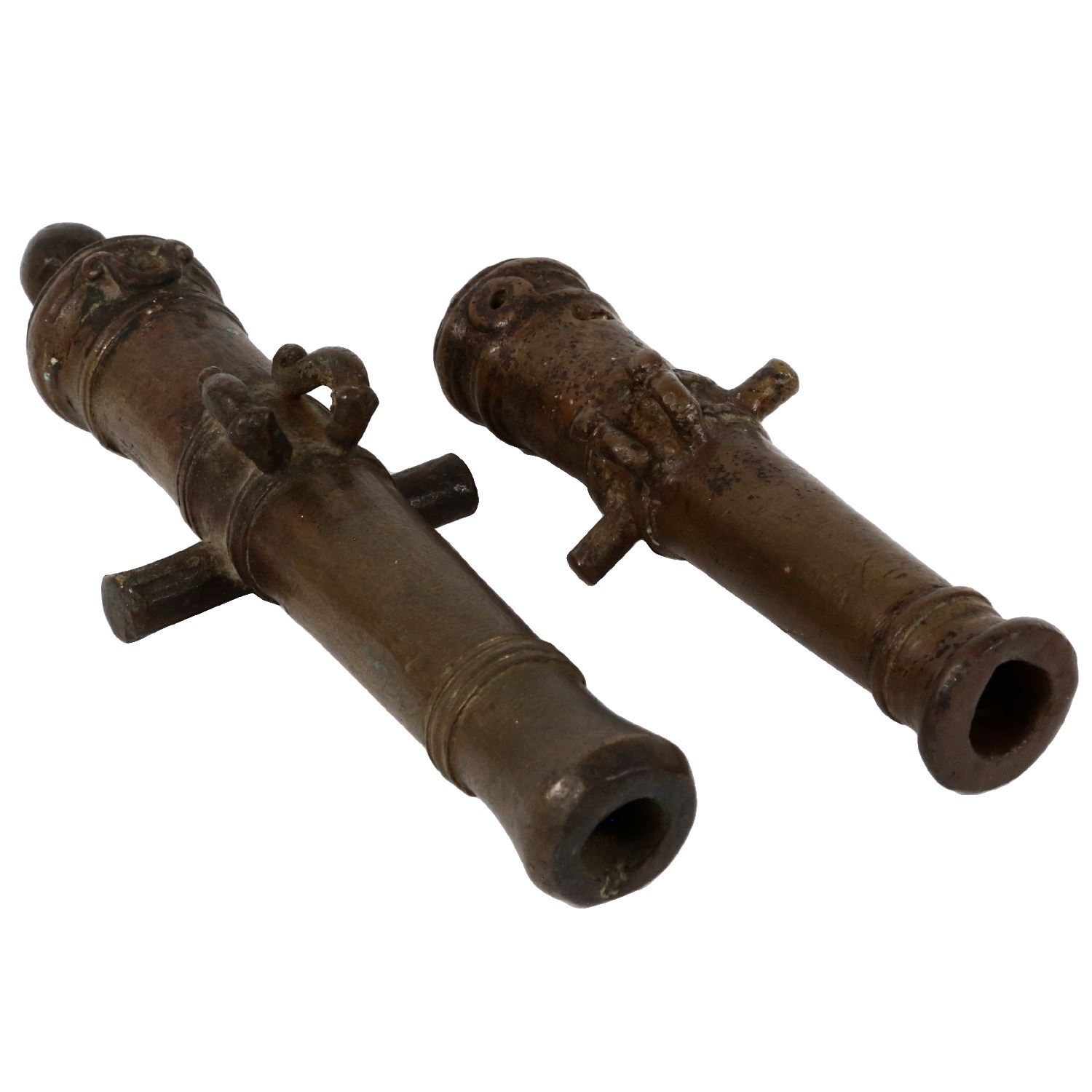 Lot of two small, antique, brass, model cannons, 1700s-1800s. 807 grams; 5-1/2" long and 7" long. Neat scale models of cannons (non-functioning), well detailed with cascabels, dolphins (lifting lugs), and touch holes, one with corroded hole on side, both dark and patinated. Pedigreed to the Mike Carulli Collection.