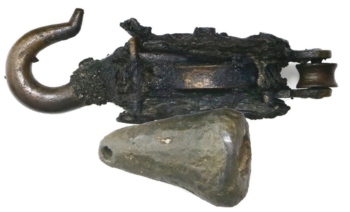 Lot of two small artifacts from an unidentified mid-1600s English Channel wreck: 1 wood-and-brass lifting block (pulley/hook) and 1 lead sounding weight. Pulley= 255 grams, 5" long; sounding weight = 336 grams, 2-1/2" tall. Darkly colored, conserved, intact brass pulley (with some soft wood still attached) is easily recognizable, sounding weight is intact and has typical hole through the top. Recovered from: Unidentified mid-1600s wreck in the English Channel