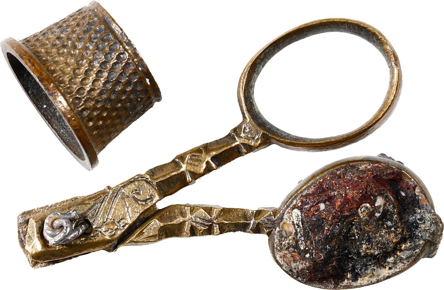 Lot of two small brass sewing instruments (thimble and scissors), ex-Guadalupe-Tolosa (1724). 14 grams total. scissors 2" long; thimble ½" tall, ¾" in diameter. Most of a pair of decorative brass scissors (the iron blades long gone), held together with a piece of wire, one of the oval loops caked with encrustation, with decorative markings and scrollwork on the shaft; the other piece an open-tip thimble, intact, with the usual dotted markings around the perimeter. From the Guadalupe-Tolosa (1724), with original certificate from Captain Tracy Bowden through his contract with the Dominican Republic and copy of the article "Graveyard of the Quicksilver Galleons" by Mendel Peterson from the December 1979 issue of National Geographic.