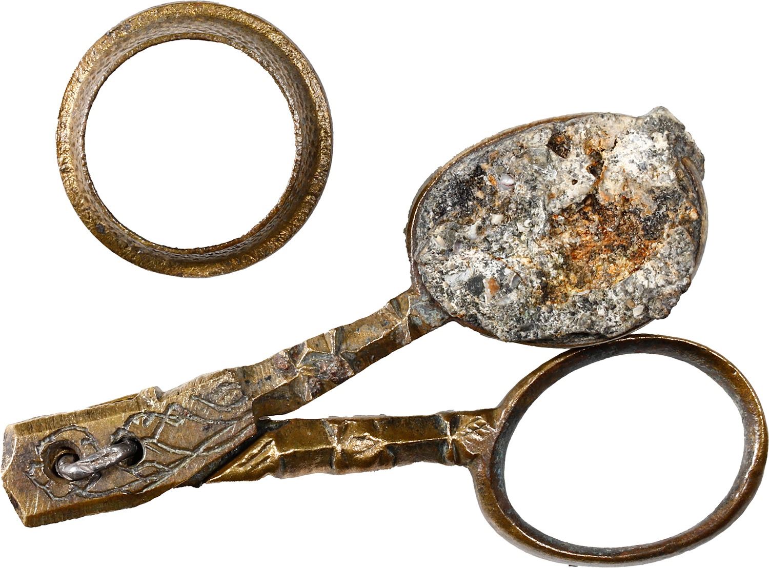 Lot of two small brass sewing instruments (thimble and scissors), ex-Guadalupe-Tolosa (1724).