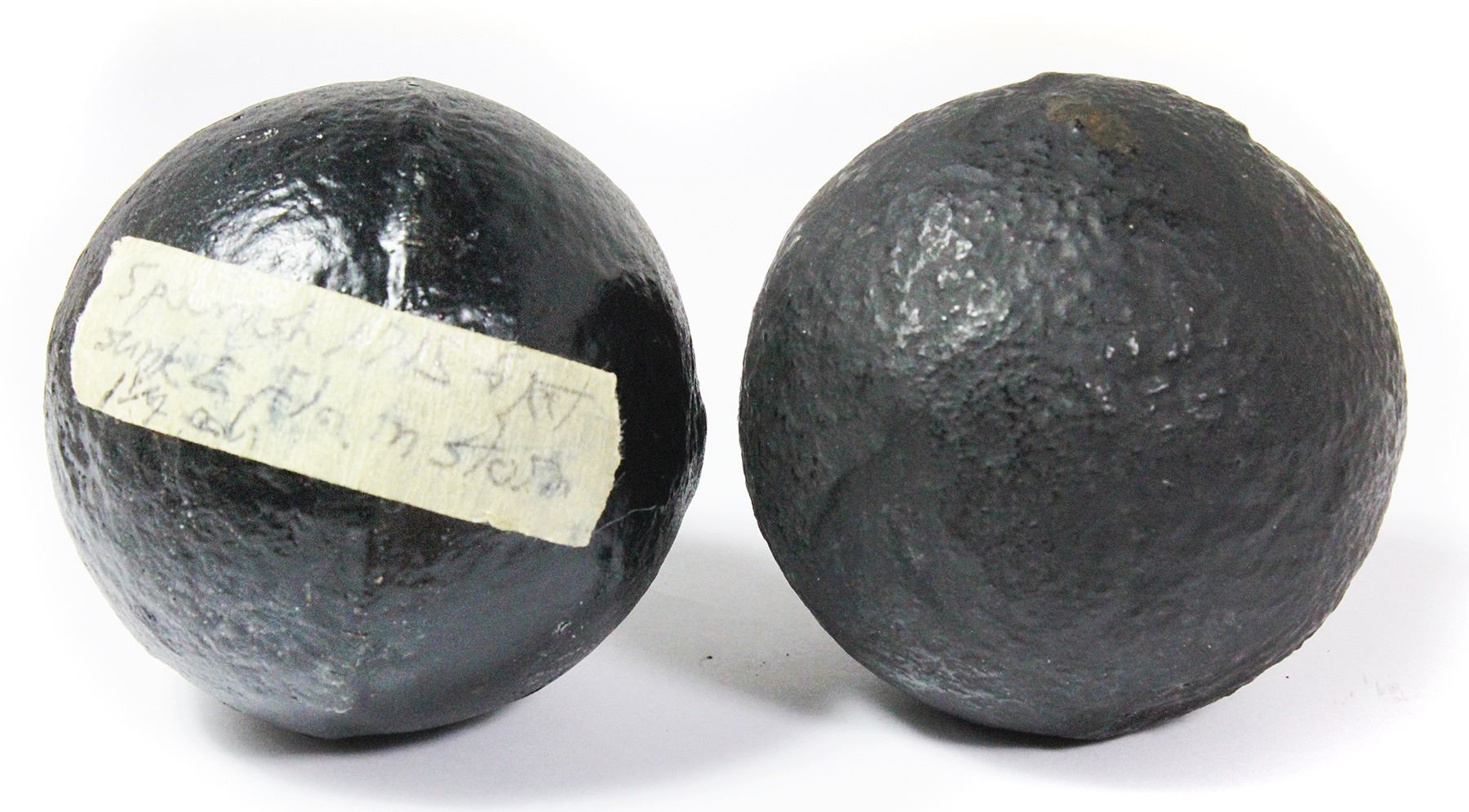 Lot of two small iron cannonballs, professionally conserved, ex-1715 Fleet. 237 and 282 grams, 2" in diameter. Two small balls in nice condition, black from professional conservation (one matte, one shiny), minor pits and cracks only. From the 1715 Fleet, pedigreed to our Auction #6, with original lot-tag #1734 (two of the three balls in that lot).