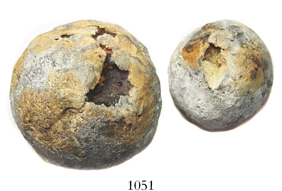 Lot of two small, lead-sheathed iron cannonballs. 1.35 kg total, diameters of 1-1/2" and 2-1/2". Before and instead of bronze, the use of iron cannonballs at sea generally meant that some rusted away before use, and this lot demonstrates an interesting way to circumvent that (and increase the weight and impact as well) by pressing thick sheets of lead onto the balls, one of them here with the rusty iron peeking from a crack but both intact and only very lightly encrusted in places. From an unidentified 1500s-1600s wreck off Santo Domingo, with Global Marine Exploration photo-certificate #SW00446. Recovered from: Unidentified 1500s-1600s wrecks off Santo Domingo