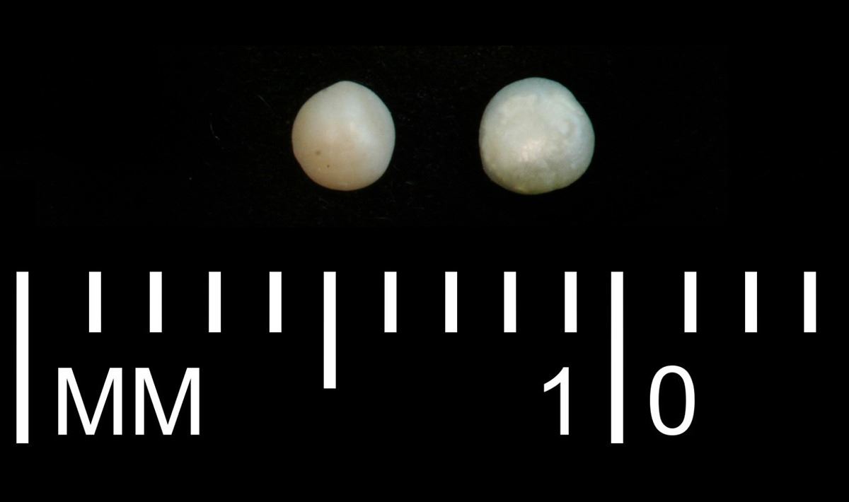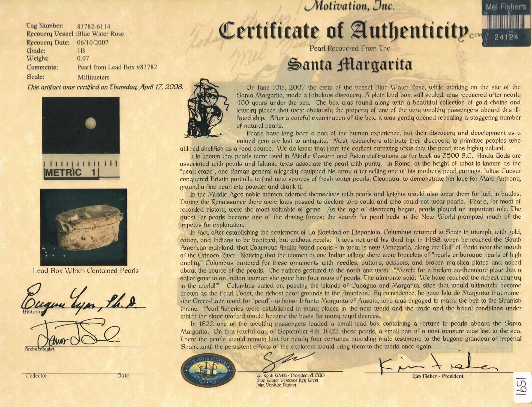Lot of two tiny natural pearls with original Fisher certificates, 0.07 carat each, both Grade 1B, ex-Santa Margarita (1622). Very small (approximately 3mm each) pearls with varying nacre, from a find of 16,000 small pearls on this wreck in 2007. Enlarged catalog images with a millimeter scale. From the Santa Margarita (1622), with original photo-certificates 83782-6114 and -6735.