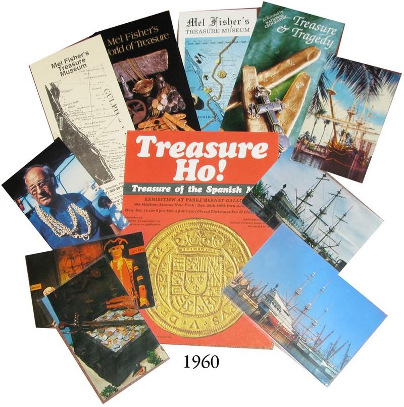 Lot of various brochures (4) and postcards (4) about Mel Fisher and his treasure museums, plus a flyer for Parke-Bernet's 1967 Treasure of the Spanish Main exhibit in New York. Brochures 4" x 9"; postcards 3-1/2" x 5-1/2" and 4" x 6"; flyer 7" x 9-3/4". The full-color postcards show Mel Fisher and scenes of and inside his floating museum, the full-size replica galleon Golden Doubloon; the brochures (all but one in color) are for his modern museum in Key West; the red-and-gold flyer for the Parke-Bernet exhibit is entitled "Treasure Ho!" and shows an enlarged photo of the obverse of a Mexican 8E Royal of 1714; all are in like-new condition.