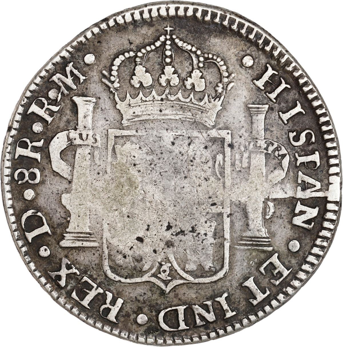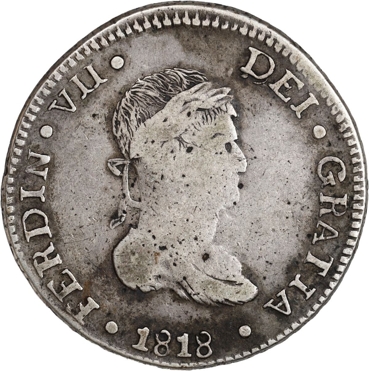 MEXICO, Durango, bust 8 reales, Ferdinand VII, 1818 RM, large bust variety. Ramírez-D8.8.2b; KM-111.2; Cal-1194. 26.62 grams. VF with typical weak strike details in the centers, spotty dark gray toning in the fields.