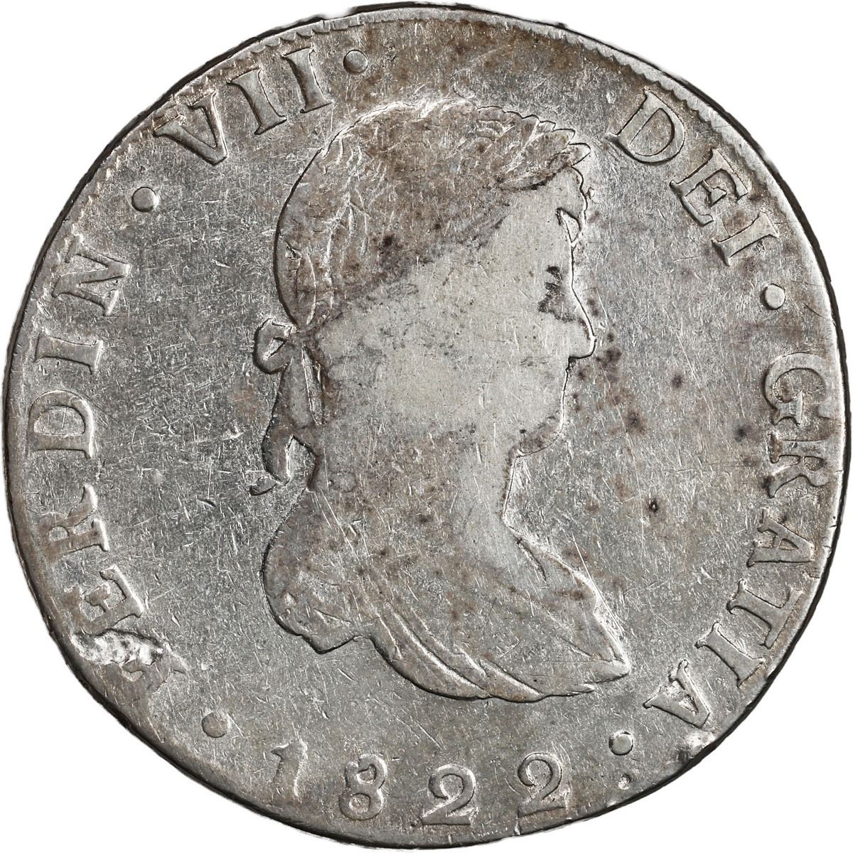 MEXICO, Guanajuato, bust 8 reales, Ferdinand VII, 1822 JM. Ramírez-Go8.12; KM-111.4; Cal-1218. 26.39 grams. Final date for this War of Independence type. XF with cleaned, lustrous surfaces, typically weakly struck bust with a bit of detail in his hair, small planchet flaw at start of king's name.