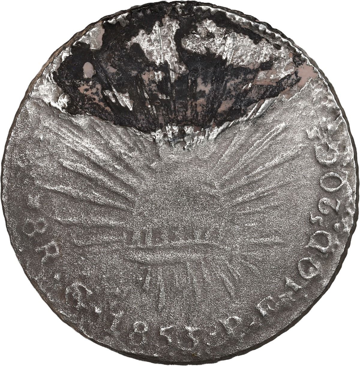 MEXICO, Guanajuato, cap-and-rays 8 reales, 1853 PF. KM-377.8; DP-Go37. 20.33 grams. Rare provenance to a British merchant steamship that was returning from New Orleans when it sank in thick fog off Ireland with hundreds of thousands of Mexican silver coins, only some of which have been recovered in modern times. Corroded surfaces with some dark encrustation on the obverse but with a clear date and assayer. Recovered from: S.S. Crescent City, sunk in 1871 off Ireland