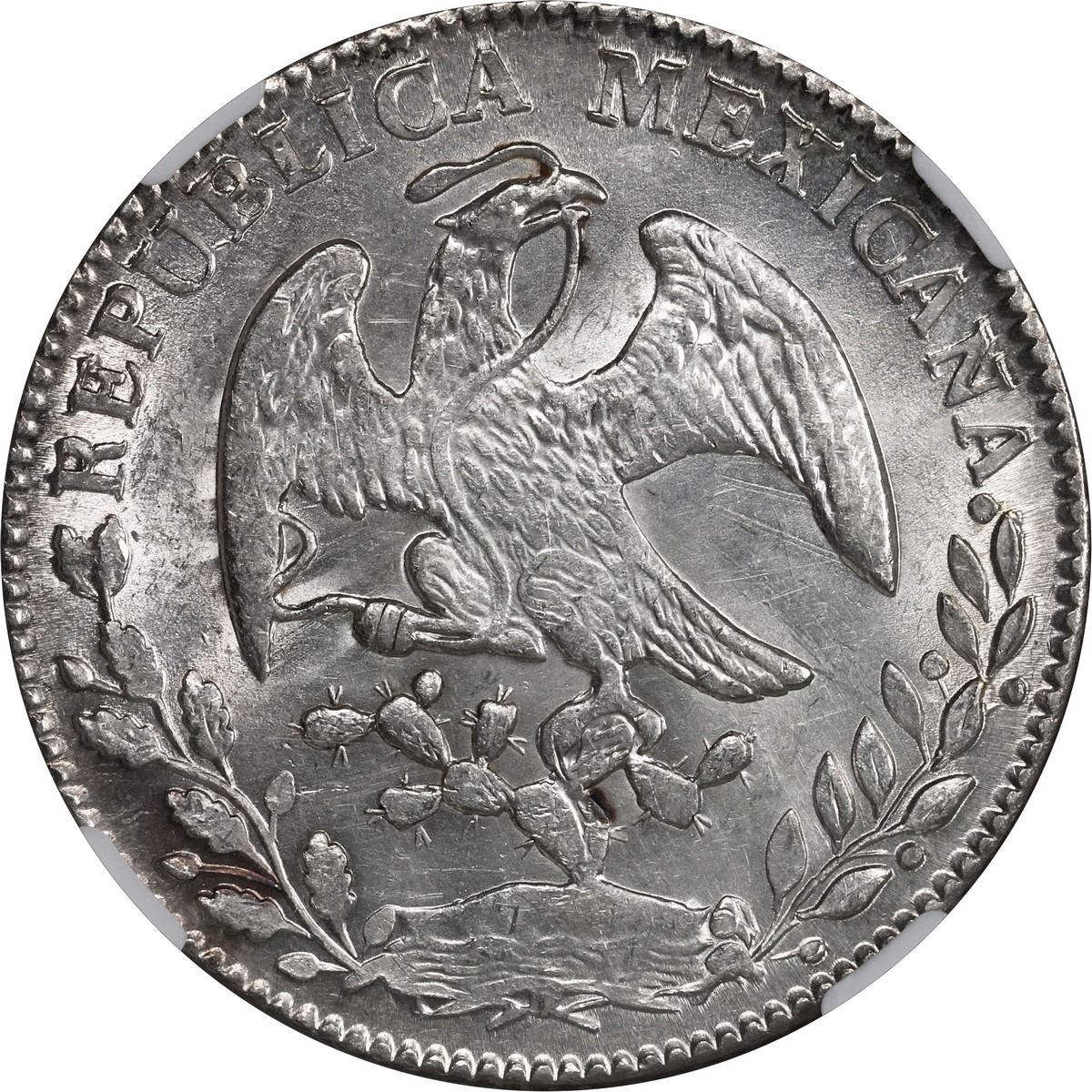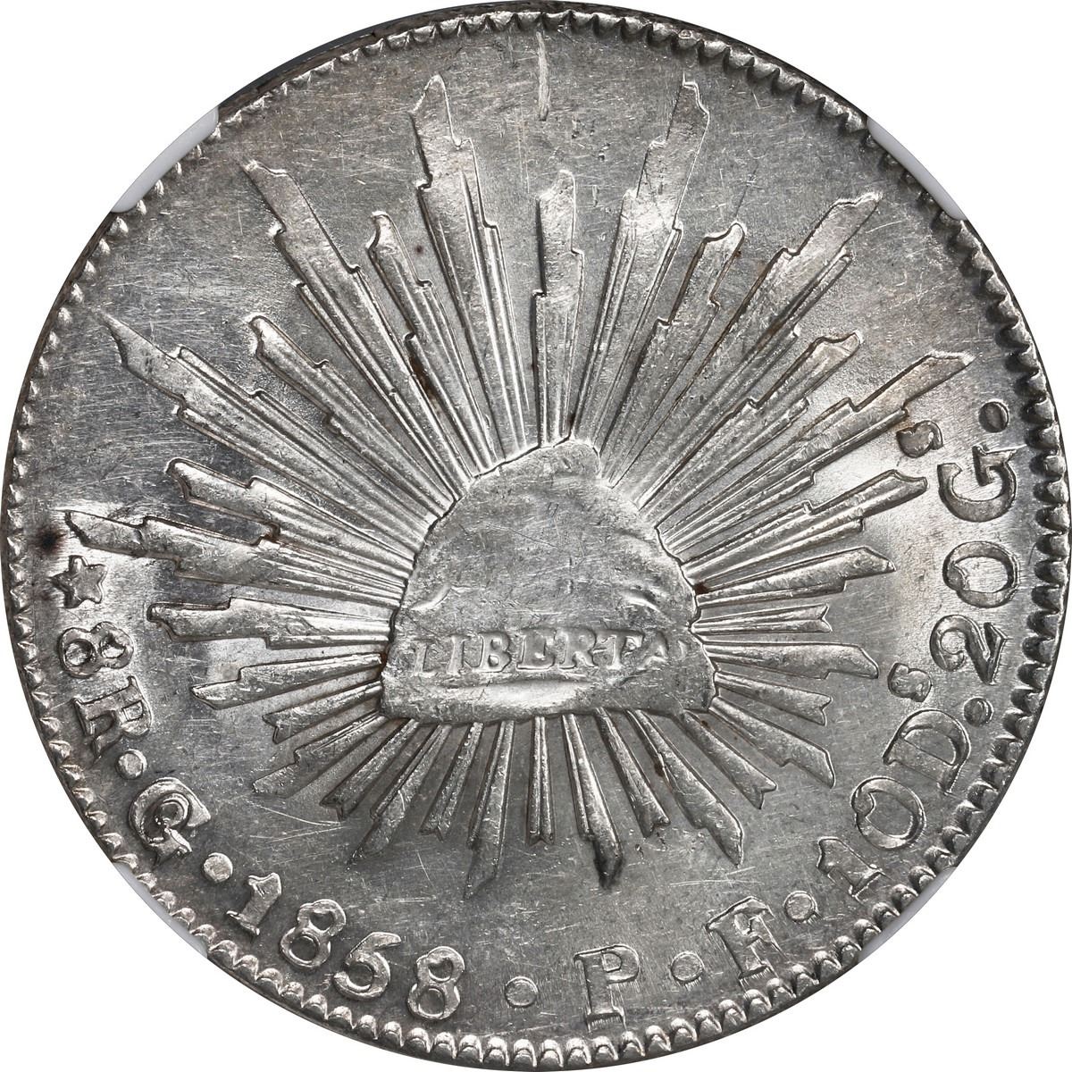 MEXICO, Guanajuato, cap-and-rays 8 reales, 1858 PF, NGC AU 58. DP-Go42; KM-377.8. Bright and flashy with luster, no toning, light bagmarks, could be MS 61 on a better day.