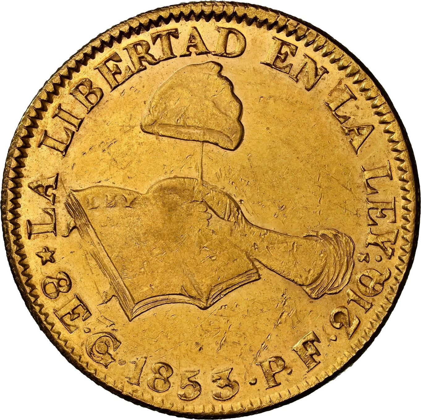 MEXICO, Guanajuato, gold 8 escudos, 1853 PF, NGC MS 62, finest known in NGC census. KM-383.7; Fr-72. Rare grade, with superb luster, light hairlines and lots of small marks, also with weak centers as usual, but overall rather choice for this type.