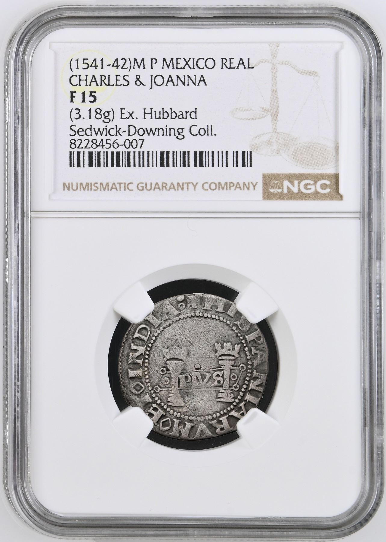 MEXICO, Mexico City, 1 real, Charles-Joanna, "Early Series," assayer P to right, mintmark M to left (oMo-oPo, plain annulets), motto as PLVS in right-leaning rhomboid panel with single annulets on either side, HISPANIARVM variety, rare, NGC F 15, ex-Sedwick-Downing, ex-Hubbard (both stated on label), ex-Laguette, Nesmith Plate Coin. Nesmith-24c; S-M4; Cal-63; KM-unlisted (7 for type). 3.18 grams. This little gem with desirable pedigree has lovely toning, despite some old scratches, with full legends and interiors. Note that the quatrefoils in the shield-side legend are less ornate than earlier emissions under this assayer. Pedigreed to the Lucio Laguette Collection and the Clyde Hubbard Collection (stated on label), with his tag, plated as a drawing on page 89 of Robert Nesmith's The Coinage of the First Mint of the Americas at Mexico City, 1536-1572 (1955), also pedigreed to the Sedwick-Downing Collection of Mexican Charles-Joanna Coinage.