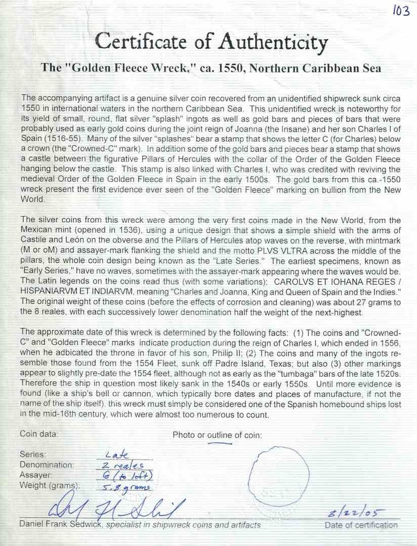 MEXICO, Mexico City, 2 reales, Charles-Joanna, "Late Series," assayer G to left, mintmark M to right (G-M). Nesmith-45 for type; Cal-94; S-M5; KM-12. 5.81 grams. Full details despite some corrosion loss on edge, darkly toned all over. With Sedwick certificate from 2005. Recovered from: “Golden Fleece wreck,” sunk ca. 1550 in the northern Caribbean