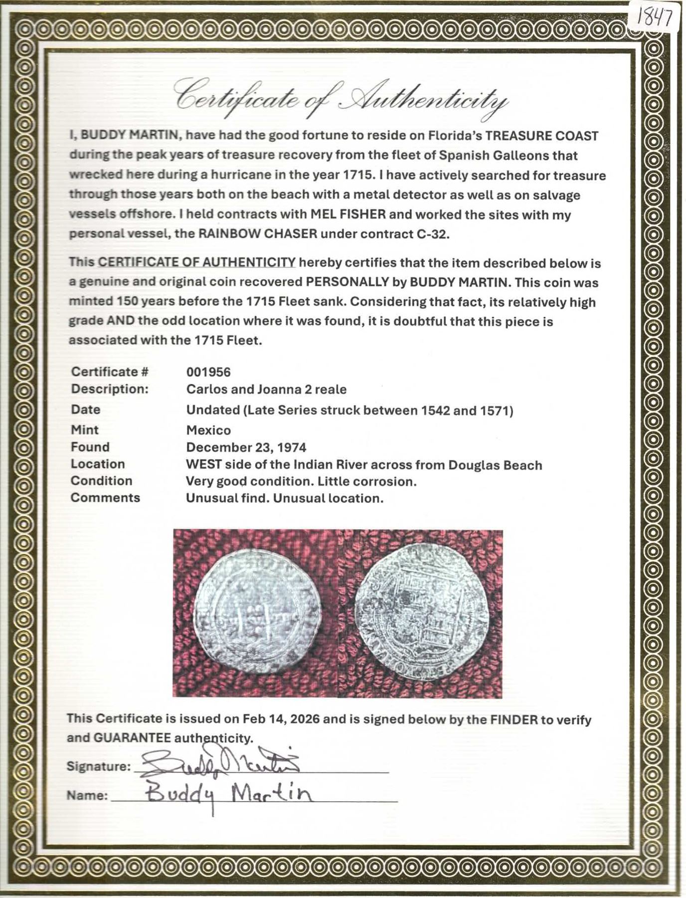 MEXICO, Mexico City, 2 reales, Charles-Joanna, "Late Series," assayer G to right, mintmark M to left (M-G), king's name as CHAROLVS, found on the east coast of Florida. Nesmith-49 for type; Cal-93; S-M5; KM-18. 6.70 grams. Much detail visible through patches of corrosion and wear, an unexpected find in this area. With photo-certificate from the finder (Buddy Martin), who describes the coin as being found in 1974 on the "WEST side of the Indian River across from Douglas Beach."