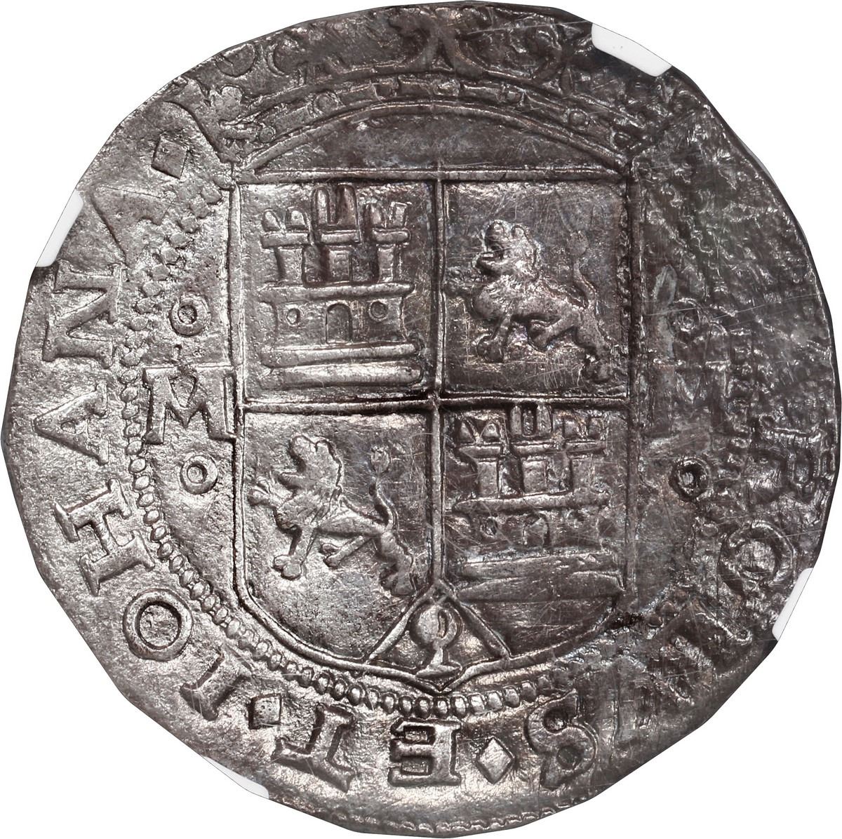 MEXICO, Mexico City, 4 reales, Charles-Joanna, "Early Series," assayer G at bottom between pillars, mintmark oMo-oMo (plain annulets), motto as PLVS in left-leaning rhomboid panel with one annulet in each side, NGC UNC details / environmental damage, ex-Pat Johnson, ex-Ortiz. Nesmith-11 for type; Cal-119; S-M2; KM-17. 13.54 grams. With lots of luster and struck on a broad flan, full legends and choice interiors, half of shield side and part of rim of pillars side dark from oxidation, hence the grade. Important pedigree as the first lot in the Swiss Bank Corp. auction of 1991 of the Emilio Ortiz Collection and later in the Pat Johnson Collection. Also noteworthy is that the pillars side is a die match with coins of assayers P and F. Pedigreed to the Pat Johnson Collection (stated on label) and to the Emilio Ortiz Collection (Swiss Bank Corp. auction of September 1991, lot 1).