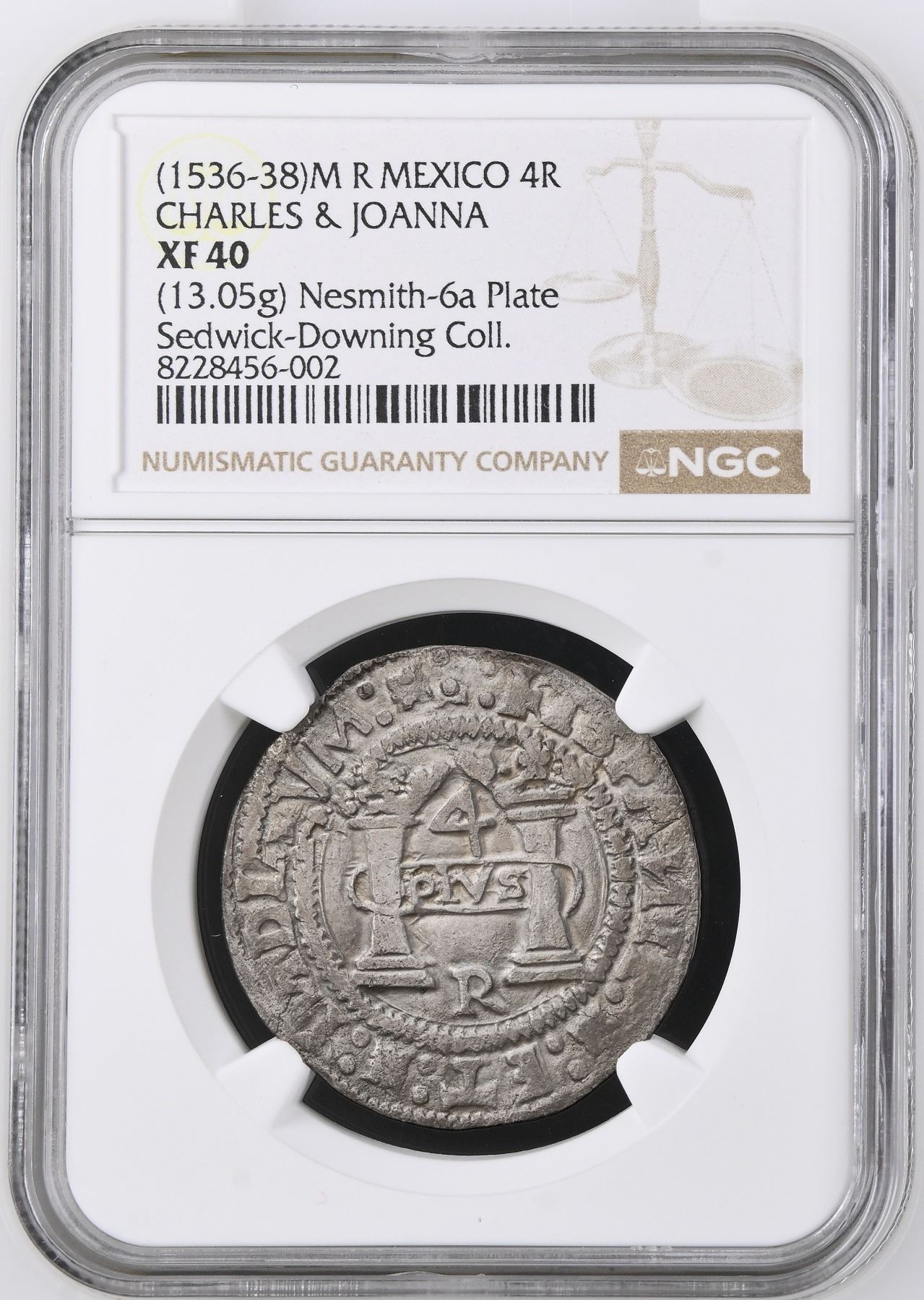 MEXICO, Mexico City, 4 reales, Charles-Joanna, "Early Series," assayer Latin R (Rincón) at bottom between pillars, oval panel with PLVS, NGC XF 40, ex-Sedwick-Downing, Nesmith Plate Coin (both stated on label). Nesmith-6a; S-M1; Cal-115; KM-16. 13.05 grams. Very light rainbow toning (low contrast), with minor hairline edge-crack on pillars side only, full legends (except for part of shield side) with curious OO doubling for IOHANA, full inner details, important pedigree. Plate Coin 6a in Nesmith's Coinage of the First Mint of the Americas at Mexico City, 1536-1572 (1955) and pedigreed to the Sedwick-Downing Collection of Mexican Charles-Joanna Coinage.