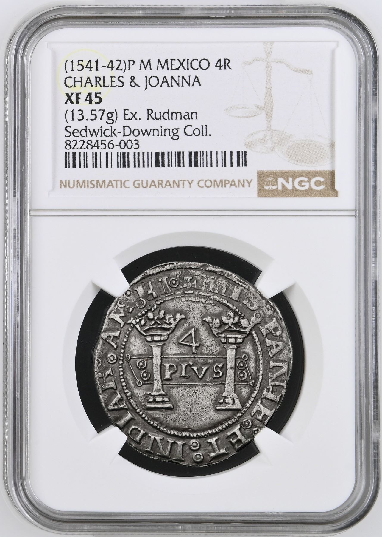 MEXICO, Mexico City, 4 reales, Charles-Joanna, "Early Series," assayer P to left, mintmark M to right (oPo-oMo, dotted annulets), motto as PLVS in left-leaning panel with two dotted annulets in each side, HISPANIE variety, very rare, NGC XF 45, ex-Sedwick-Downing, ex-Rudman (both stated on label). Nesmith-21; S-M4; Cal-77; KM-17. 13.57 grams. Choice full interiors and legends on both sides, with lovely rich toning all over, a very desirable (and very rare) example of early assayer P with HISPANIE in the legend and use of K instead of H. Note that examples of P-M are much rarer than M-P. Pedigreed to the Isaac Rudman Collection and to the Sedwick-Downing Collection of Mexican Charles-Joanna Coinage.