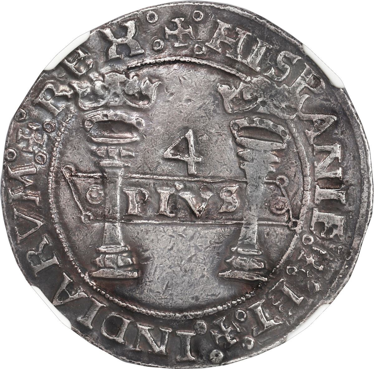 MEXICO, Mexico City, 4 reales, Charles-Joanna, "Early Series," assayer P to right, mintmark M to left (oMo-oPo), motto as PLVS in left-leaning rhomboid panel with one annulet in each side, very rare, NGC XF 45. Nesmith-26 for type; Cal-123; S-M4; KM-17. Early emission from this assayer with REX and HISPANIE in the legend and cross potents with annulets in each corner used as stops between words in the legends, rare misspelling of IOANA (only four known with this error), struck on a broad flan with full and clear legends and interior details, lovely gunmetal toning throughout. Note a similarly graded coin sold in Sedwick Auction 38 for $20,000 plus buyer's premium.