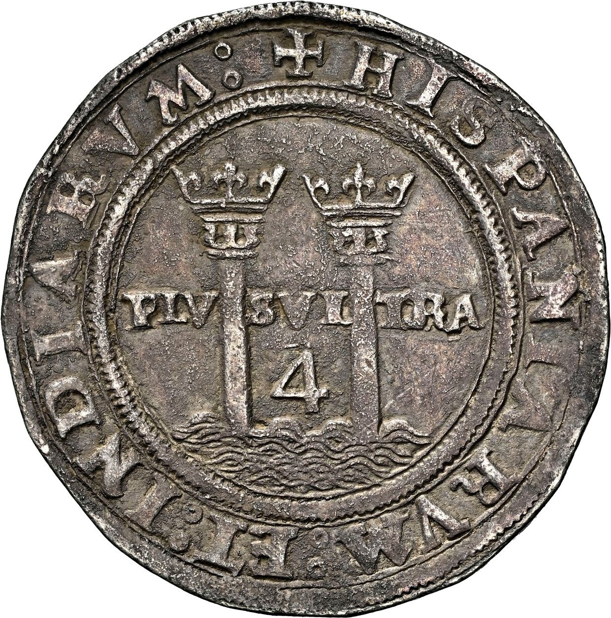MEXICO, Mexico City, 4 reales, Charles-Joanna, "Late Series," assayer G to right, mintmark M to left (M-G), NGC XF details / environmental damage (Shipwreck Blue Label). Nesmith-50g type; Cal-127; S-M5; KM-18. Very broad flan extending past the outer borders, also well struck (no doubling or flatness), full legends and interiors, darkly toned all over but no corrosion. Recovered from: “Golden Fleece wreck,” sunk ca. 1550 in the northern Caribbean
