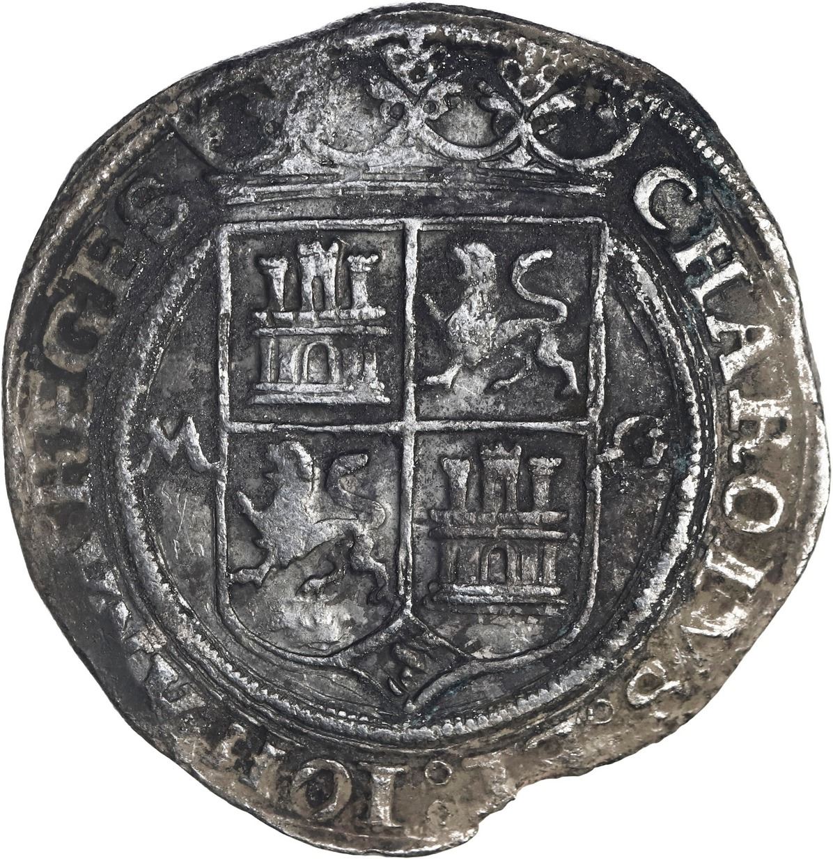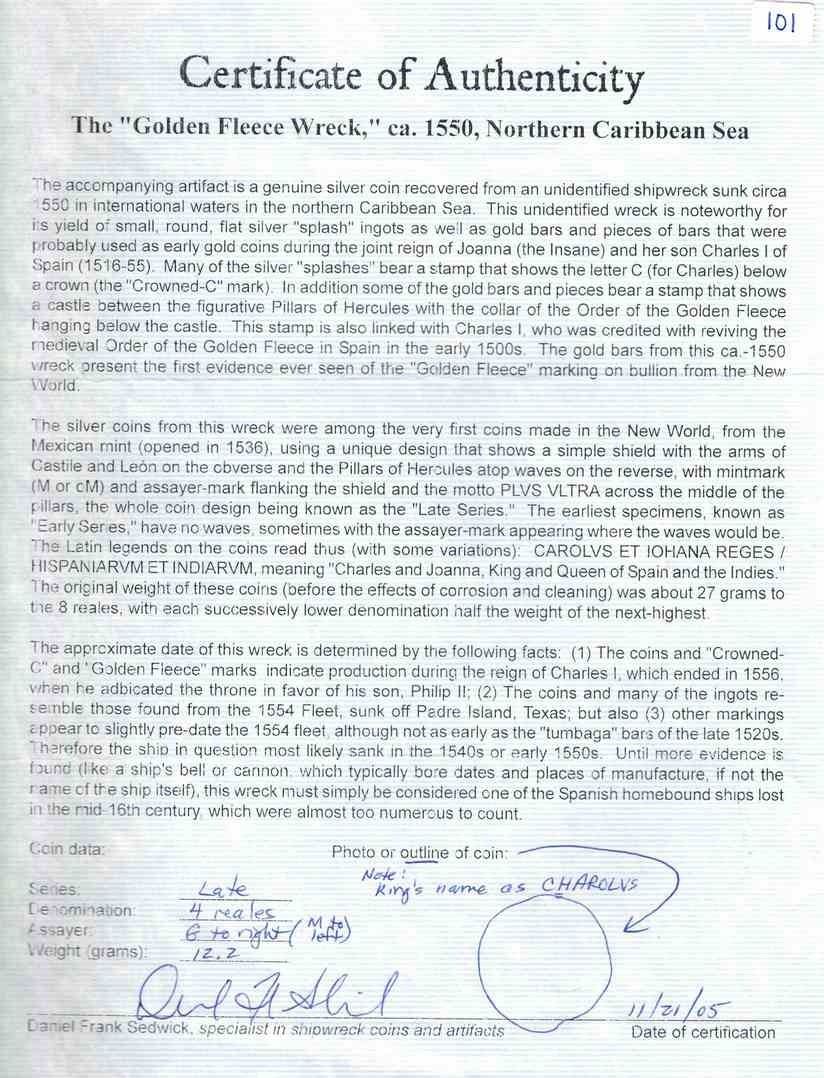 MEXICO, Mexico City, 4 reales, Charles-Joanna, "Late Series," assayer G to right, mintmark M to left (M-G), king's name as CHAROLVS. Nesmith-50 for type; Cal-125; S-M5; KM-18. 12.20 grams. Broad flan extending past outer borders here and there, darkly toned with some horn silver and small bits of edge lost to corrosion, full details without doubling or flatness. With Sedwick certificate from 2005. Recovered from: “Golden Fleece wreck,” sunk ca. 1550 in the northern Caribbean