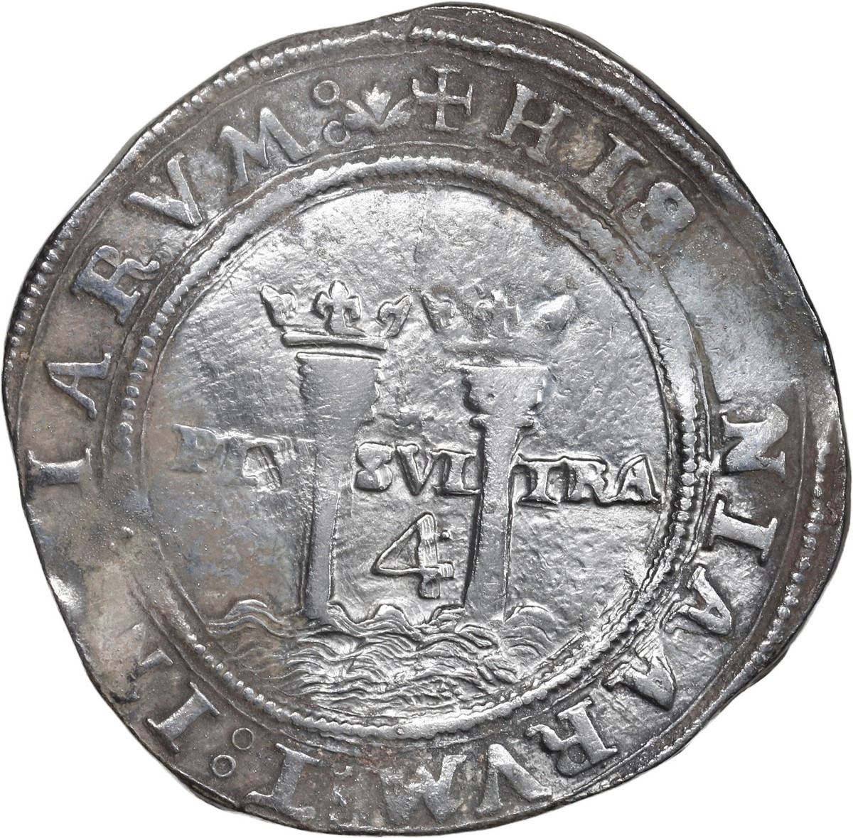 MEXICO, Mexico City, 4 reales, Charles-Joanna, "Late Series," assayer G to right, mintmark M to left (M-G), king's name as CHAROLVS. Nesmith-50 type; Cal-125; S-M5; KM-18. 13.53 grams. Interesting manifestation of HISPANIAARVM in legend (probably from a rotated double-strike), slightly unevenly struck on a broad flan extending past the outer borders (full legends) giving the coin more of an oblong shape than the usual, trace of corrosion only near part of edge, dark gunmetal toning, AU details. Recovered from: “Golden Fleece Wreck,” sunk ca. 1550 in the northern Caribbean