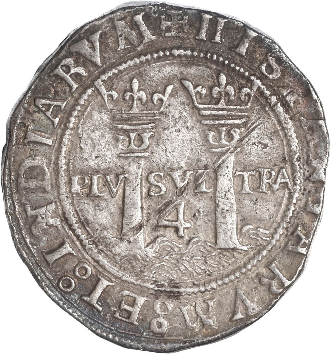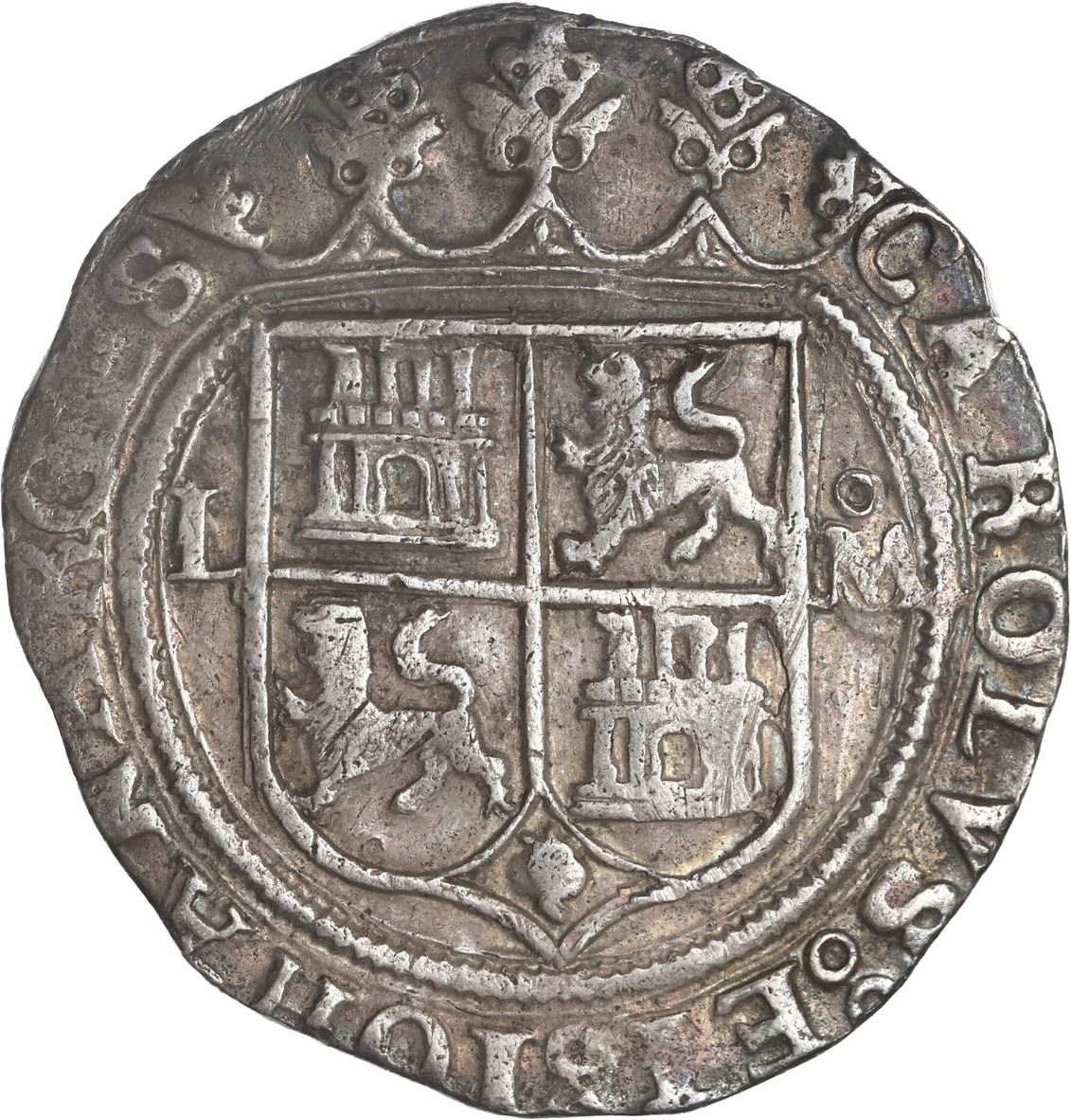 MEXICO, Mexico City, 4 reales, Charles-Joanna, "Late Series," assayer L to left, mintmark oM/O to right (L-oM/O), rare, ex-Hubbard. Nesmith-94 for type; Cal-136; S-M9; KM-18. 13.61 grams. Richly rainbow-toned XF with full legends and inner details, the pillars side slightly off-center and with diagonal scratch (old), first we have seen of this over-assayer type. Pedigreed to the Clyde Hubbard Collection, with his tag.