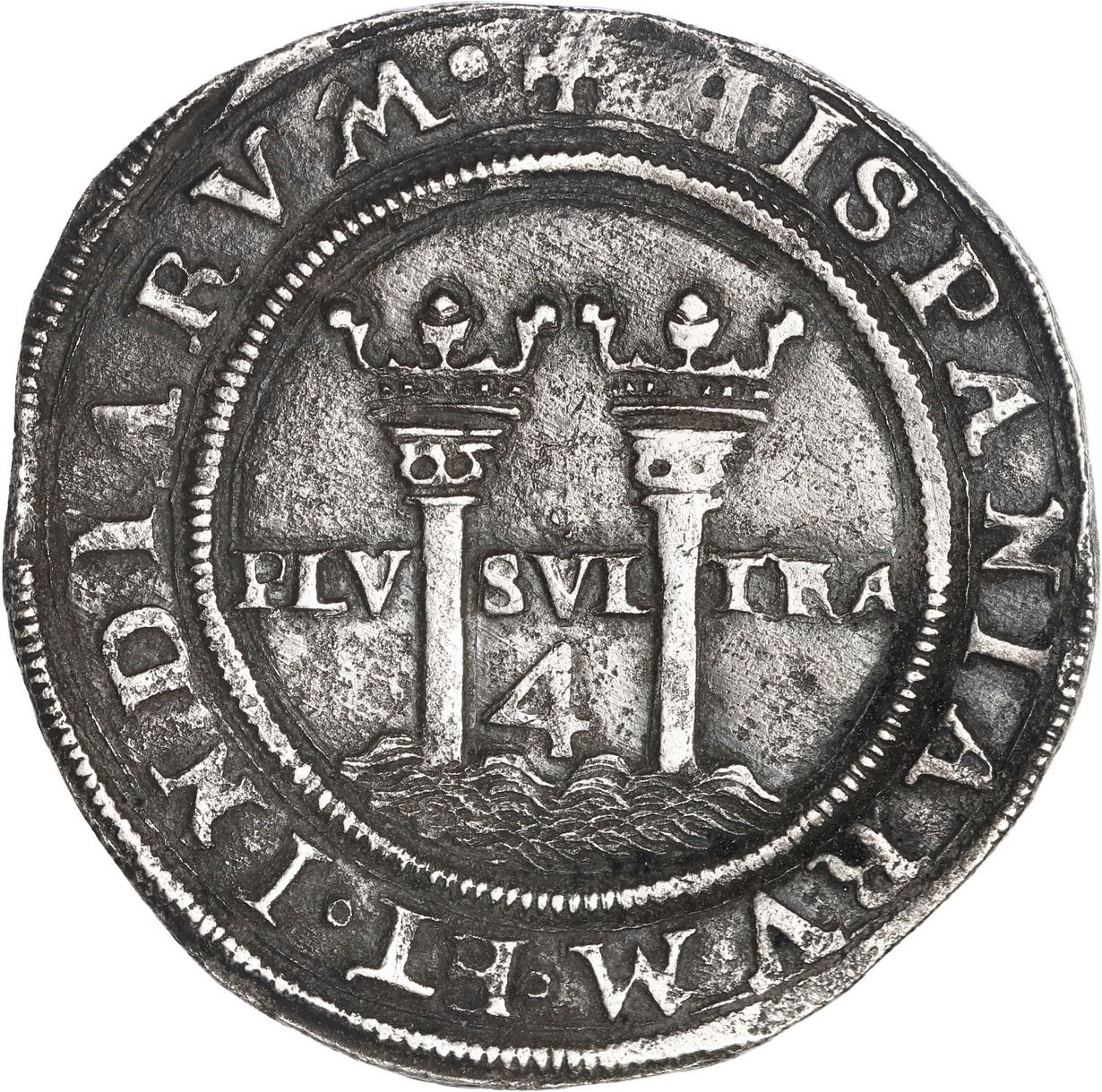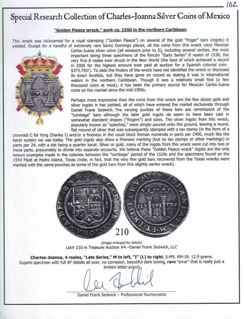 MEXICO, Mexico City, 4 reales, Charles-Joanna, "Late Series," assayer L to right, mintmark M to left (M-L), broken L-punch (looks like an I), ex-"Golden Fleece wreck" Research Collection. Nesmith-86; Cal-135; S-M9; KM-18. 12.87 grams. Choice, bold, AU example with no corrosion, attractively toned (great contrast), full legends and interiors, and perfectly struck on a broad, round flan with no doubling or flatness. From the "Golden Fleece wreck" Research Collection (Sedwick Auction 4, with original lot-tag 210), with Sedwick photo-certificate. Recovered from: “Golden Fleece wreck,” sunk ca. 1550 in the northern Caribbean