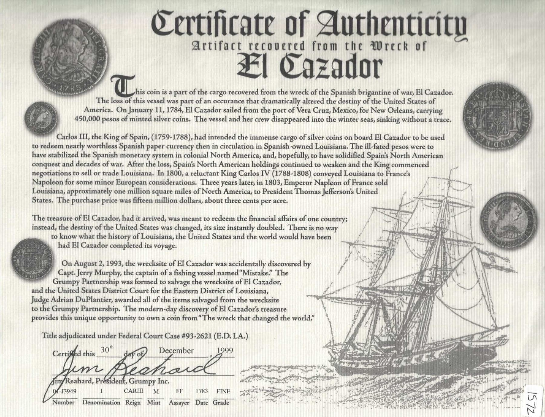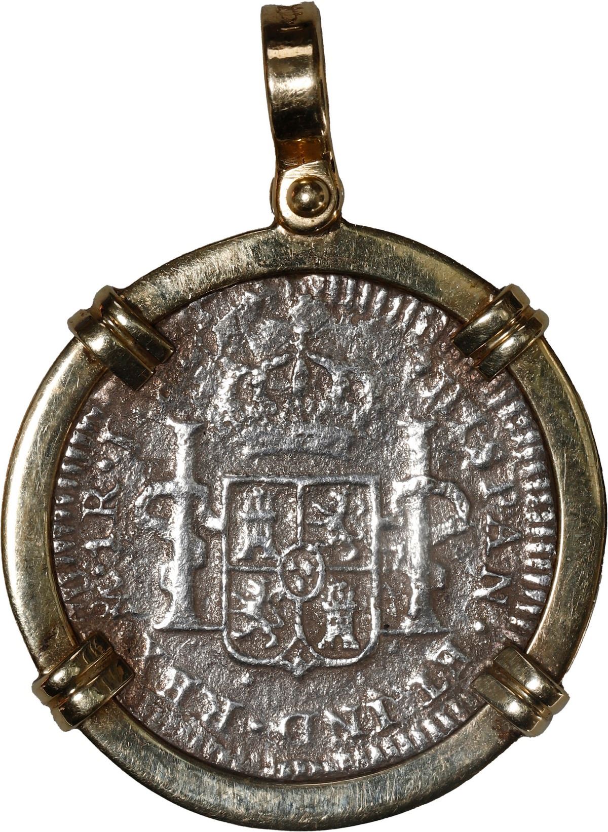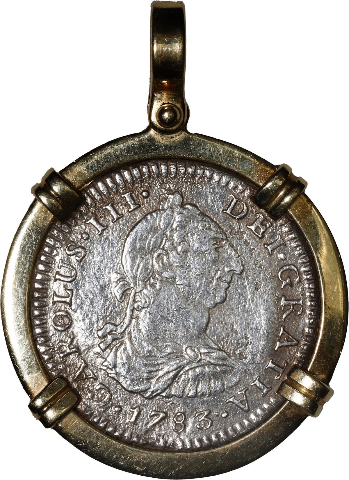 MEXICO, Mexico City, bust 1 real, Charles III, 1783 FF, ex-Cazador (1784), mounted in 14K gold pendant with shackle bail. Yonaka-M1.83; KM-78.2; Cal-438. 5.34 grams total. Nice bust and clear date, silvery AU with some surface corrosion, fastened into a round bezel setting. From the Cazador (1784), with certificate.