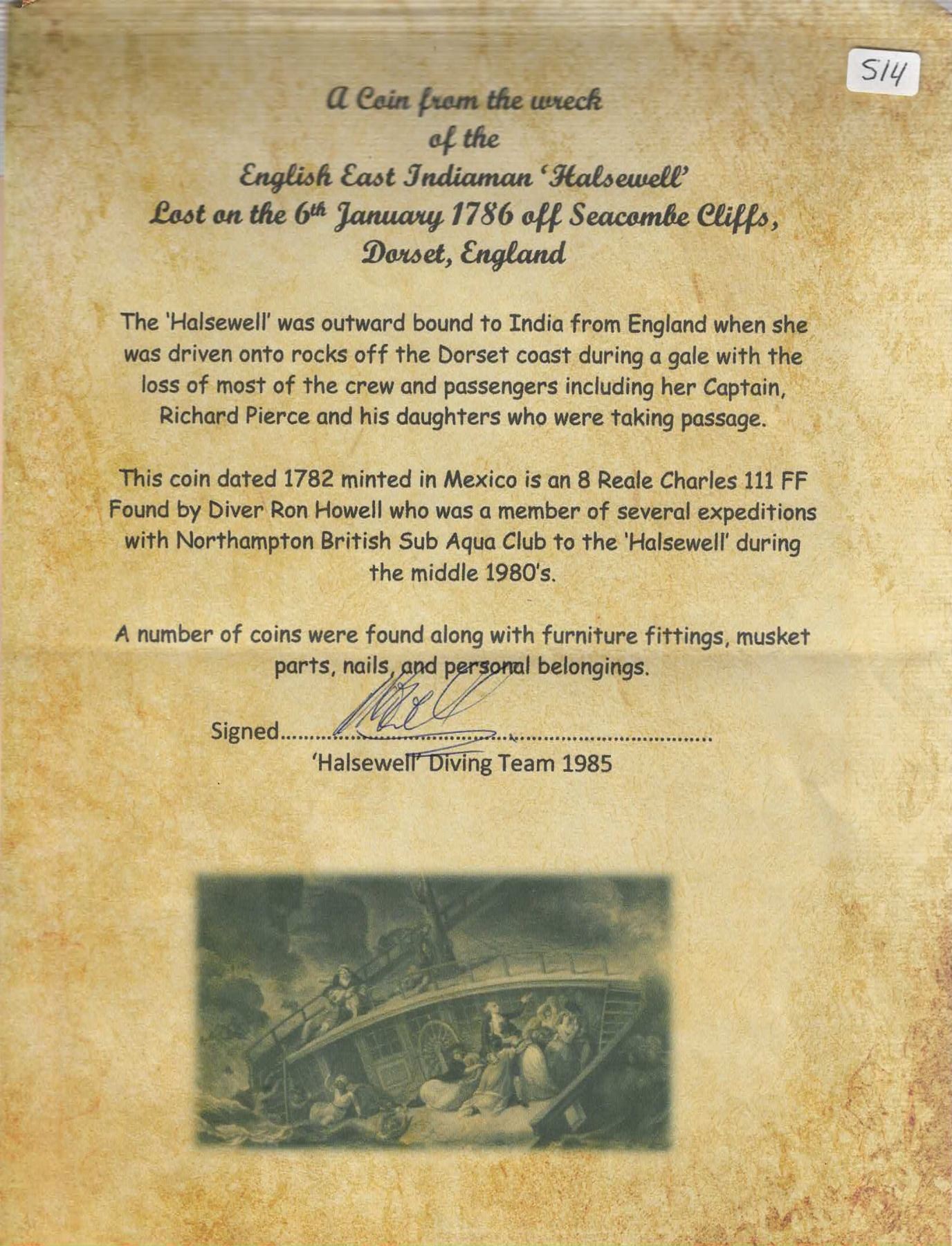 MEXICO, Mexico City, bust 8 reales, Charles III, 1782 FF. Yonaka-M8.82; KM-106.2; Cal-1122. 26.65 grams. AU- details with nice rich toning, no corrosion but a few small marks and flaws including a flan-crack on lower half, overall rather choice for a shipwreck coin. With original (generic) certificate from the salvors. Recovered from: Halsewell, sunk in 1786 off Dorset, south of England