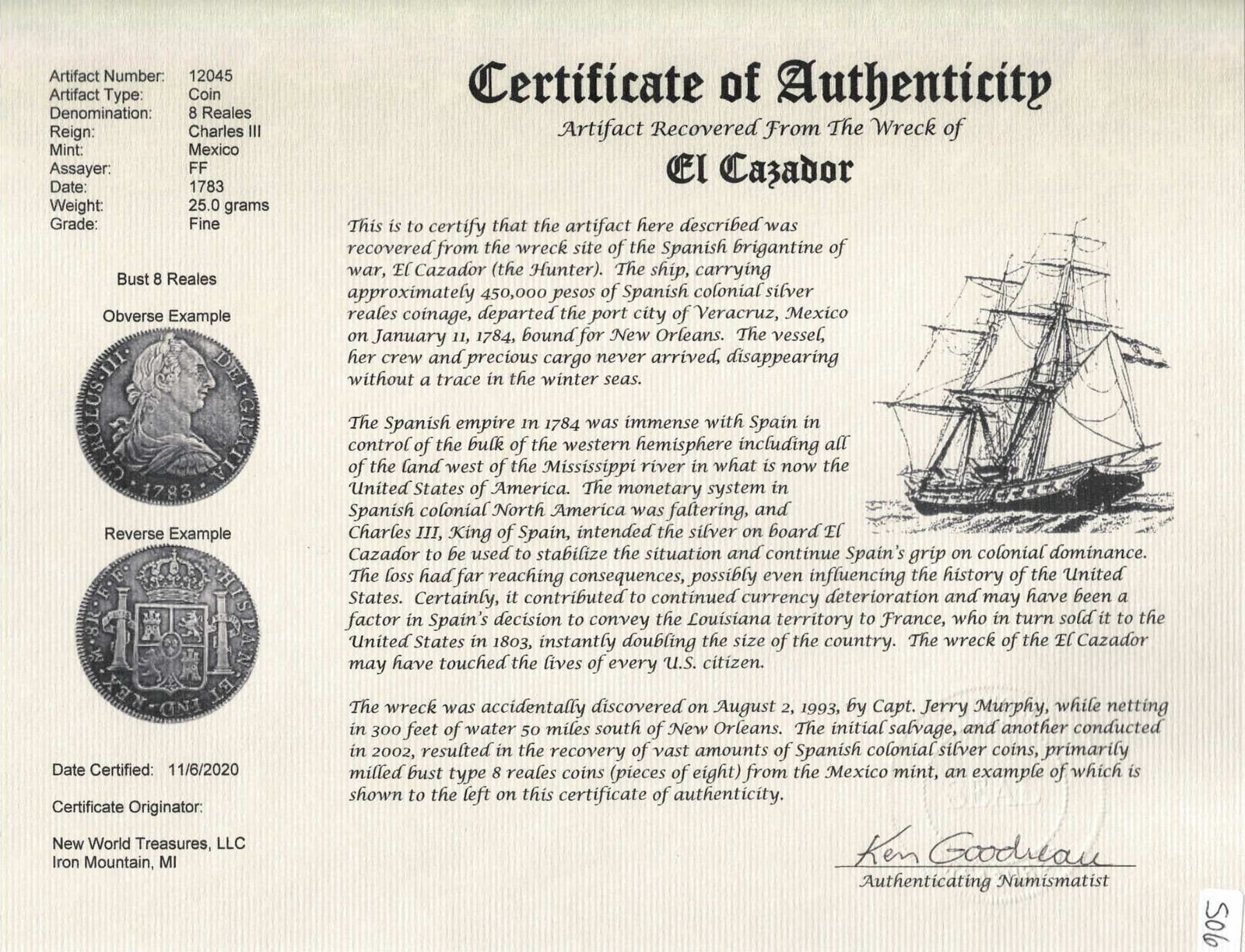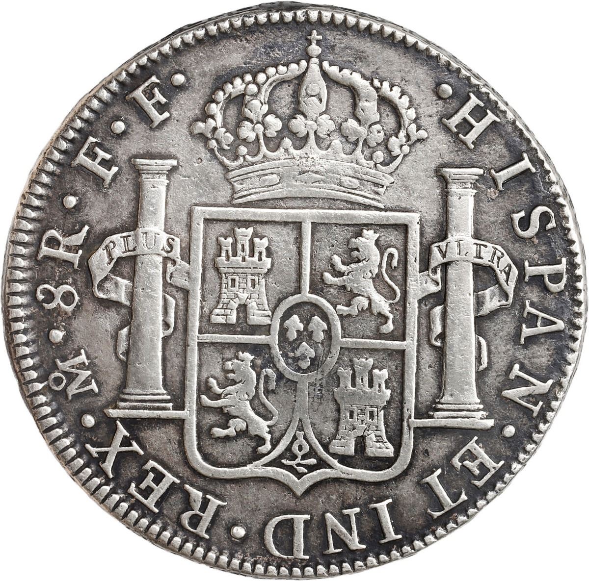 MEXICO, Mexico City, bust 8 reales, Charles III, 1783 FF. Yonaka-M8.83; KM-106.2; Cal-1124. 24.98 grams. Very choice with lovely contrasting toning, no corrosion, AU- details, full rims. With photo-certificate. Recovered from: El Cazador, sunk in 1784 in the Gulf of Mexico
