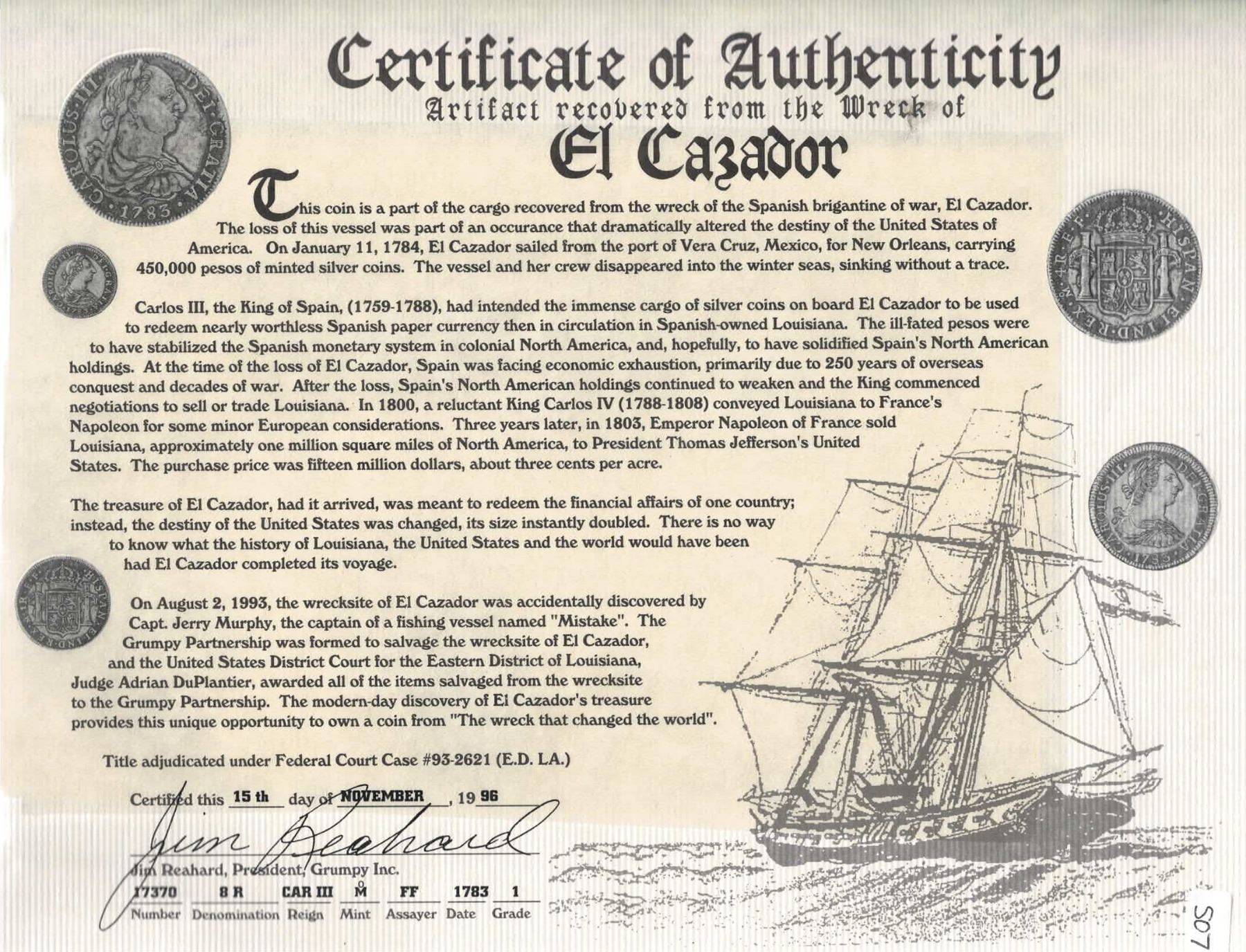 MEXICO, Mexico City, bust 8 reales, Charles III, 1783 FF. Yonaka-M8.83; KM-106.2; Cal-1124. 24.99 grams. Bold AU details, good rims, no toning, minimal surface corrosion. With original certificate 17370 and envelope from the salvors. Recovered from: El Cazador, sunk in 1784 in the Gulf of Mexico