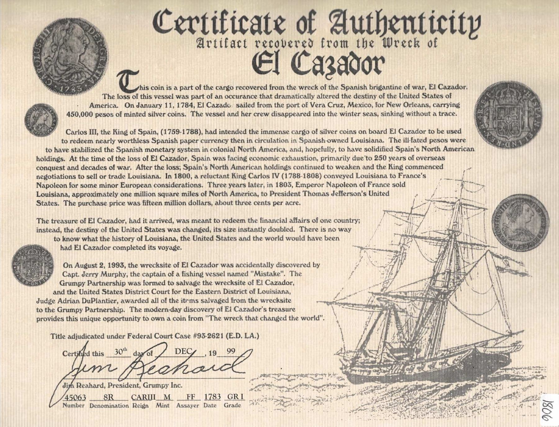 MEXICO, Mexico City, bust 8 reales, Charles III, 1783 FF. Yonaka-M8.83; Cal-1124; KM-106.2. 23.07 grams. Corroded but with a clear bust, date, and assayer. With certificate 45063 from the salvors. Recovered from: El Cazador, sunk in 1784 in the Gulf of Mexico