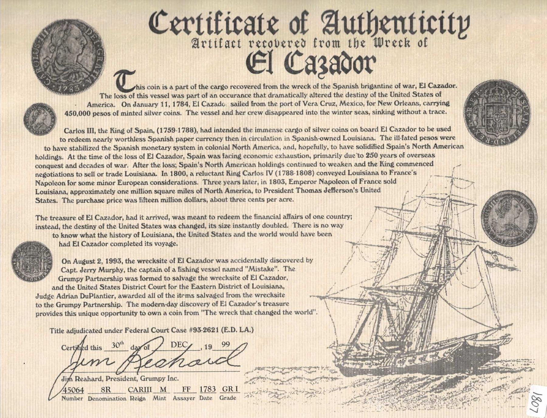 MEXICO, Mexico City, bust 8 reales, Charles III, 1783 FF. Yonaka-M8.83; Cal-1124; KM-106.2. 23.46 grams. A bit corroded around the edges but with some decent detail. With certificate 45064 from the salvors. Recovered from: El Cazador, sunk in 1784 in the Gulf of Mexico