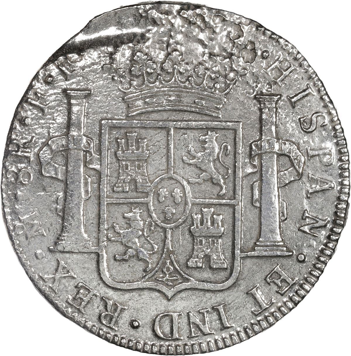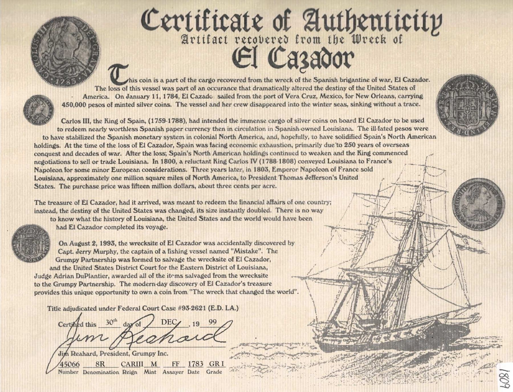MEXICO, Mexico City, bust 8 reales, Charles III, 1783 FF. Yonaka-M8.83; Cal-1124; KM-106.2. 22.48 grams. Silvery piece with corrosion along the edges, clear date and assayer. With certificate 45066 from the salvors. Recovered from: El Cazador, sunk in 1784 in the Gulf of Mexico