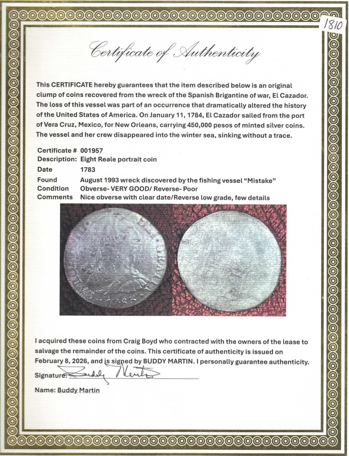 MEXICO, Mexico City, bust 8 reales, Charles III, 1783 FF. Yonaka-M8.83; Cal-1124; KM-106.2. 16.72 grams. Nice obverse detail but with a smooth, corroded reverse. With photo-certificate. Recovered from: El Cazador, sunk in 1784 in the Gulf of Mexico