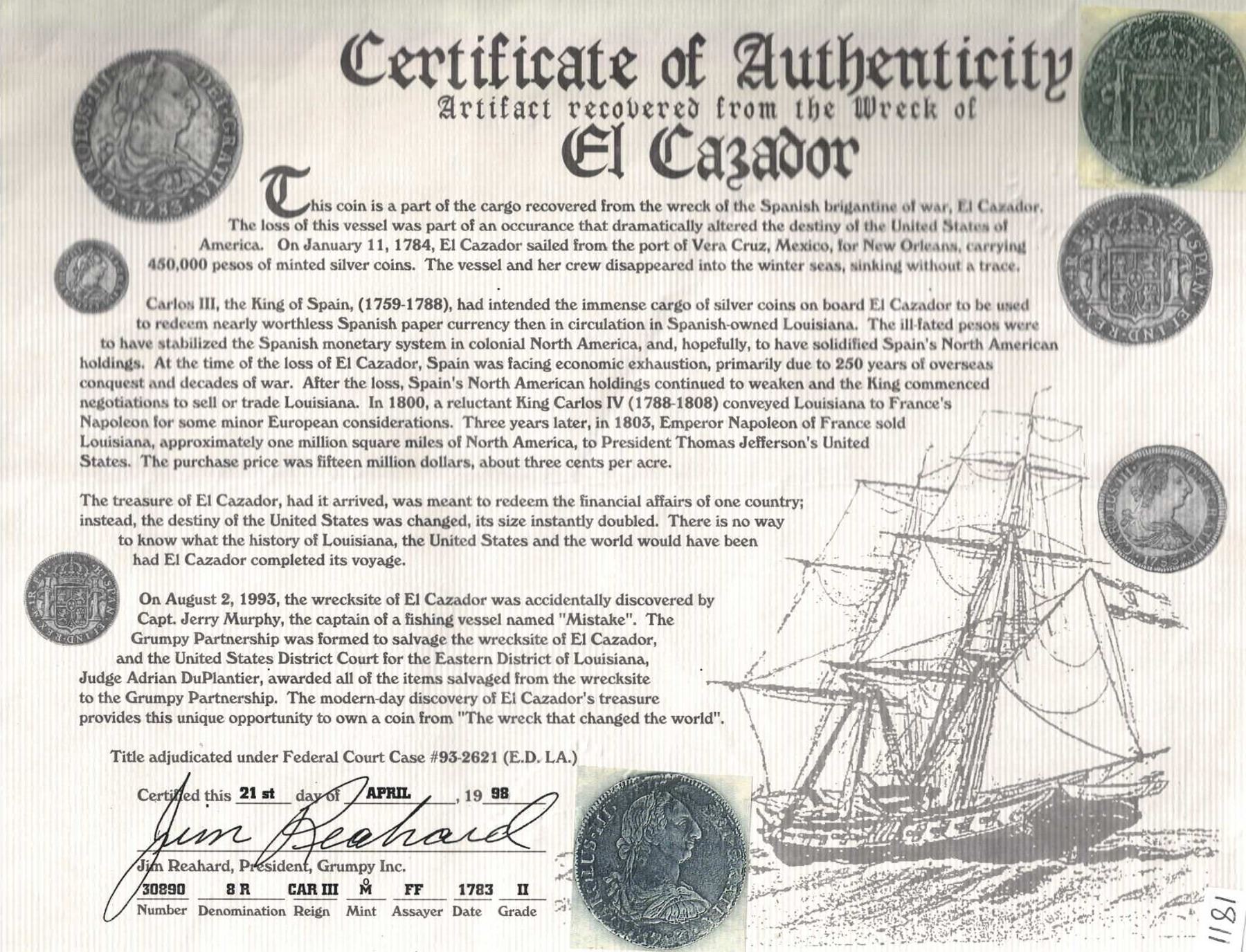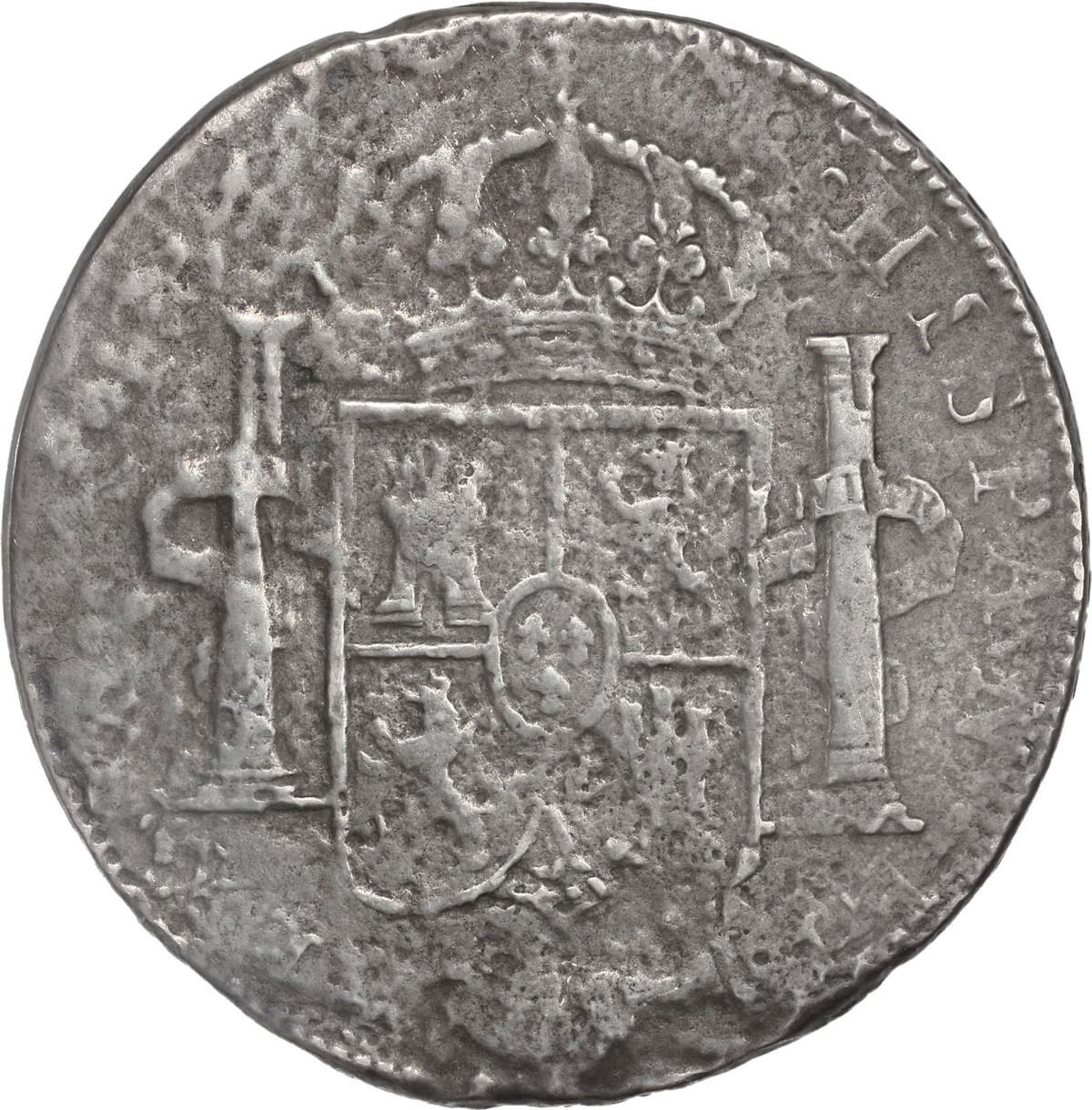 MEXICO, Mexico City, bust 8 reales, Charles III, 1783 FF. Yonaka-M8.83; Cal-1124; KM-106.2. 22.43 grams. Corroded around the edges but with decent central detail, steely gray toning. With original certificate #30890 from the salvor (Reahard, Grumpy Inc.). Recovered from: El Cazador, sunk in 1784 in the Gulf of Mexico