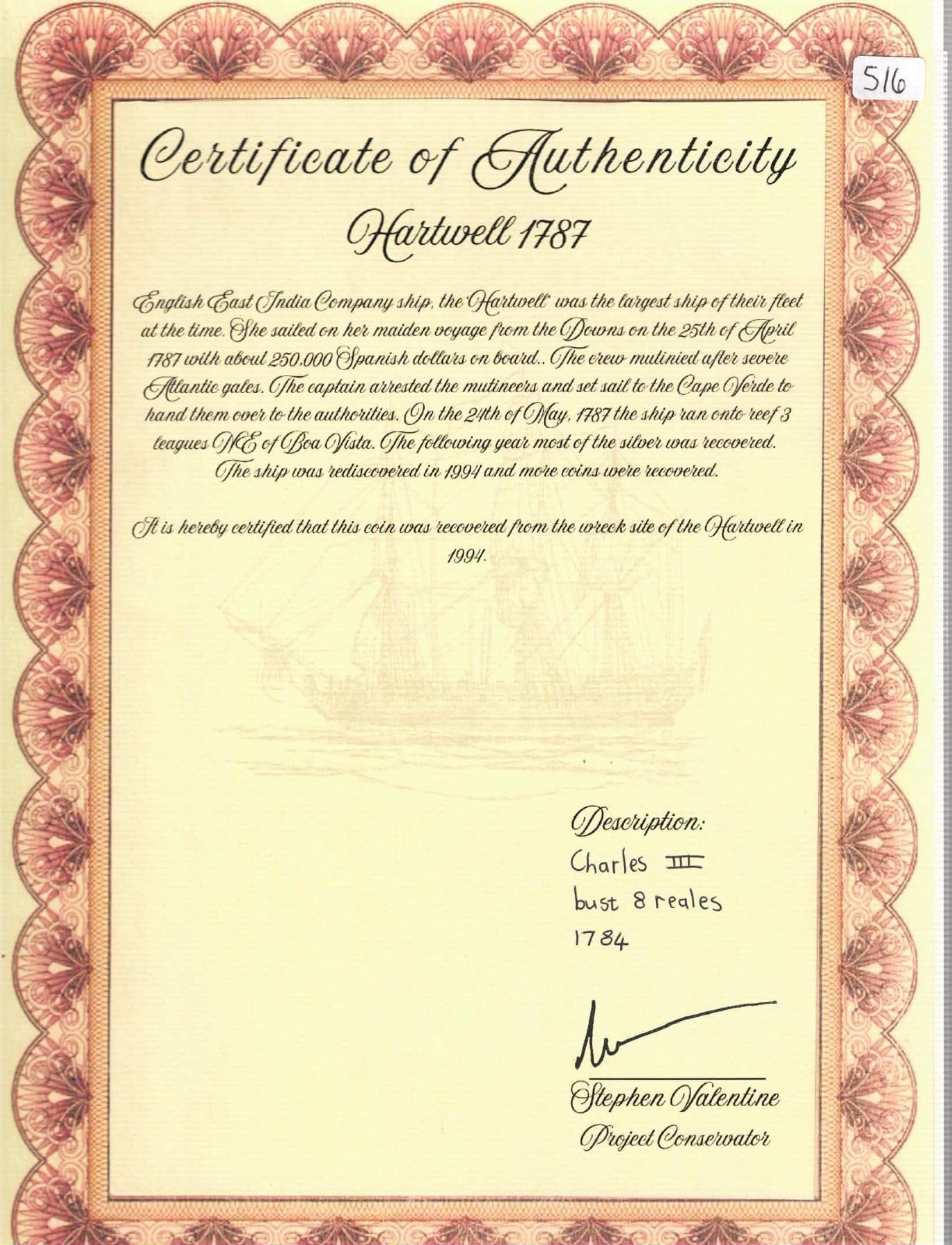 MEXICO, Mexico City, bust 8 reales, Charles III, 1784 FM. Yonaka-M8.84a; KM-106.2; Cal-1126. 23.90 grams. Bold XF details with light toning, areas of light corrosion. Pedigreed to the Steve Valentine Collection, with original certificate from the salvor/conservator. Recovered from: Hartwell, sunk in 1787 off South Africa