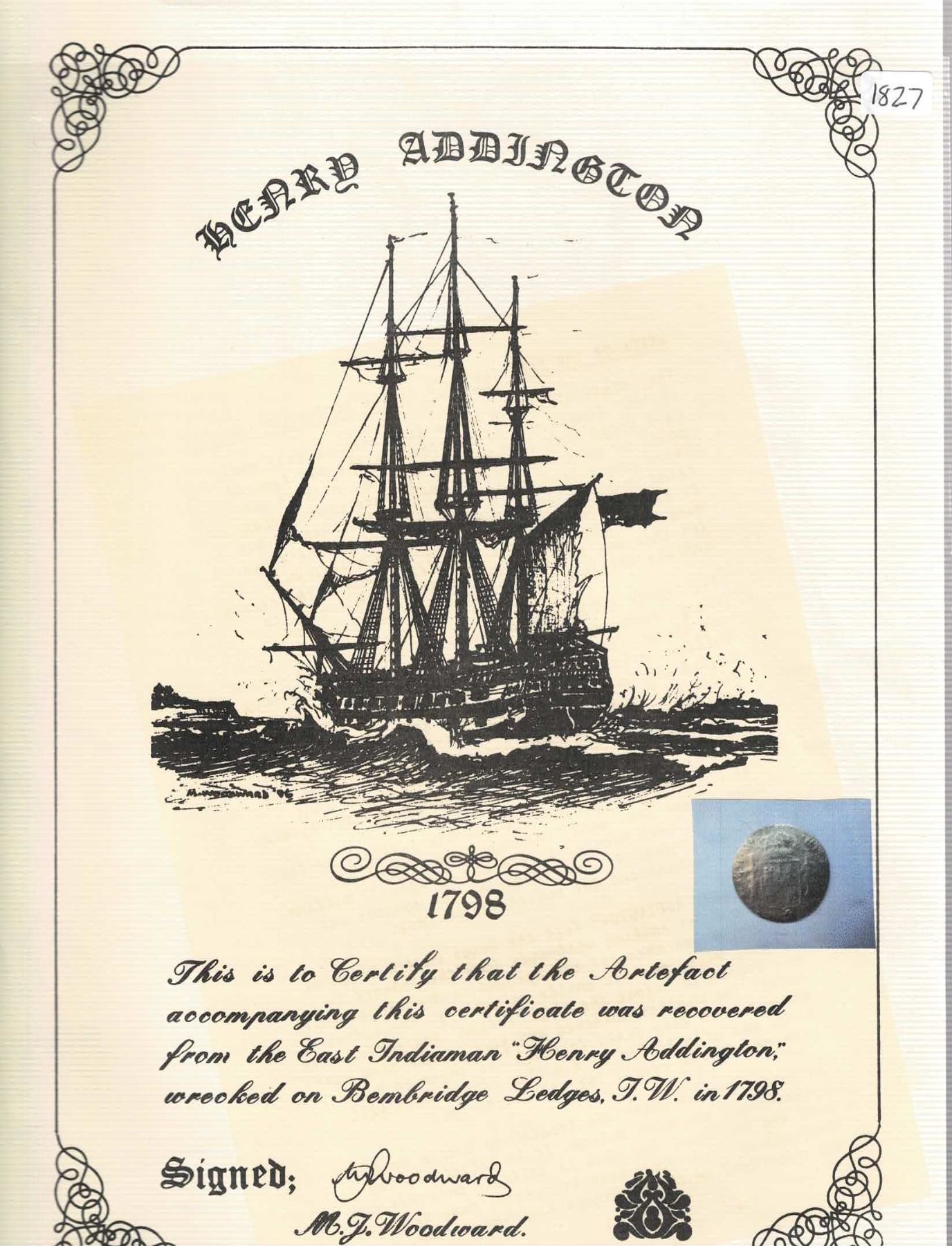 MEXICO, Mexico City, bust 8 reales, Charles III, 1788 FM, rare provenance. Yonaka-M8.88; KM-106.2A; Cal-1132 . 12.39 grams. Rare provenance to this privateer ship whose captain, Thomas Wakefield, operated under an English letter of marque; the ship sank in heavy fog after striking Bembridge Ledge off the Isle of Wight. Heavily corroded, smooth surfaces with just enough of the date and assayer visible, patch of dark encrustation on the obverse. With original photo-certificate from the salvor. Recovered from: Henry Addington, sunk in 1798 off the Isle of Wight, south of England