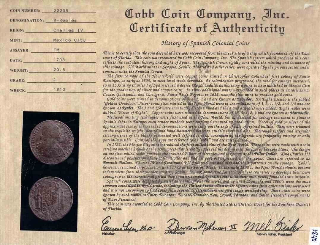 MEXICO, Mexico City, bust 8 reales, Charles IV, 1793 FM. Yonaka-M8.93; Cal-955; KM-109. 20.55 grams. XF with patchy corrosion, weak but certain date. With original Cobb Coin Co. (Fisher) and photo-certificate 22238. Recovered from: "1810 wreck," sunk in 1810 off the east coast of Florida
