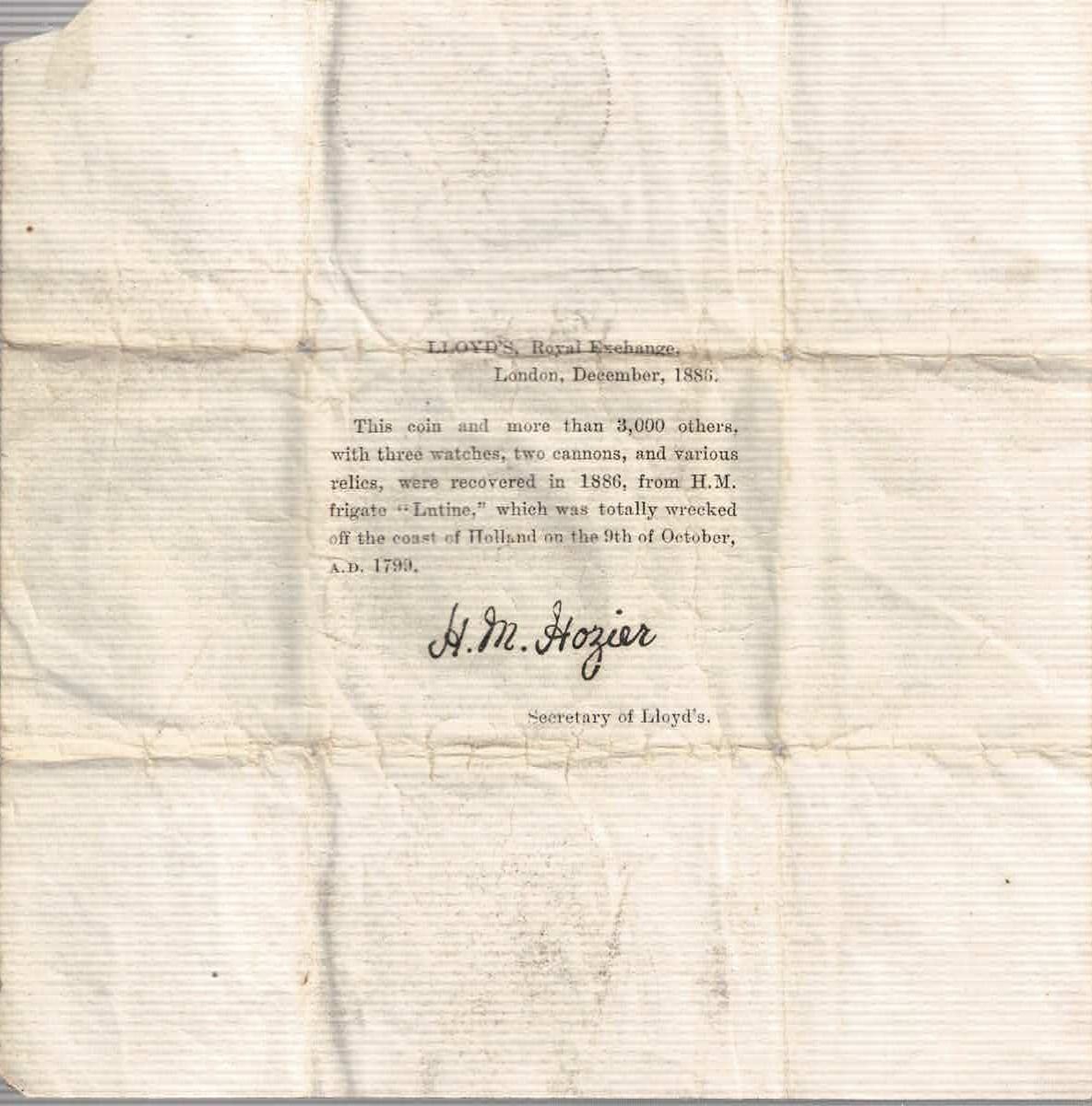 MEXICO, Mexico City, bust 8 reales, Charles IV, 1793 FM. Yonaka-M8.93; Cal-955; KM-109. 26.44 grams. AU details, practically no corrosion, low-contrast toning, slightly off-center strike, desirable old certificate. With original Lloyd's certificate from 1886. Recovered from: HMS Lutine, sunk in 1799 off West Frisia, Netherlands